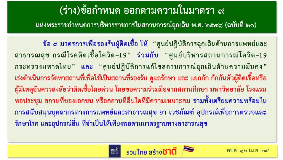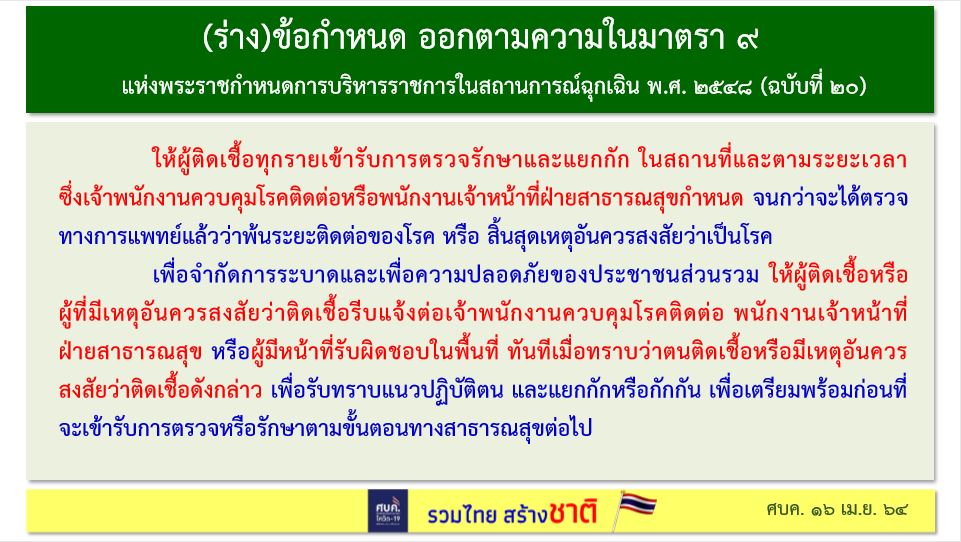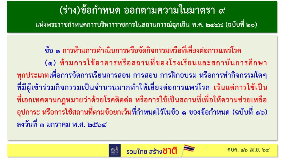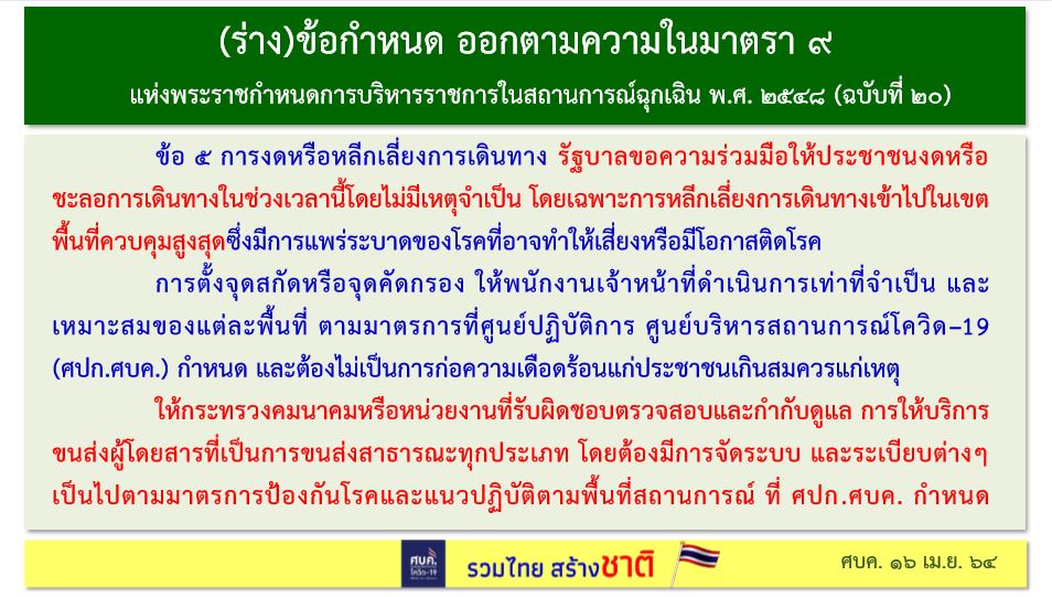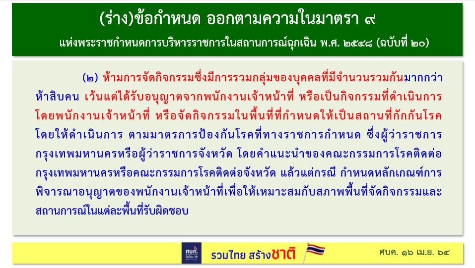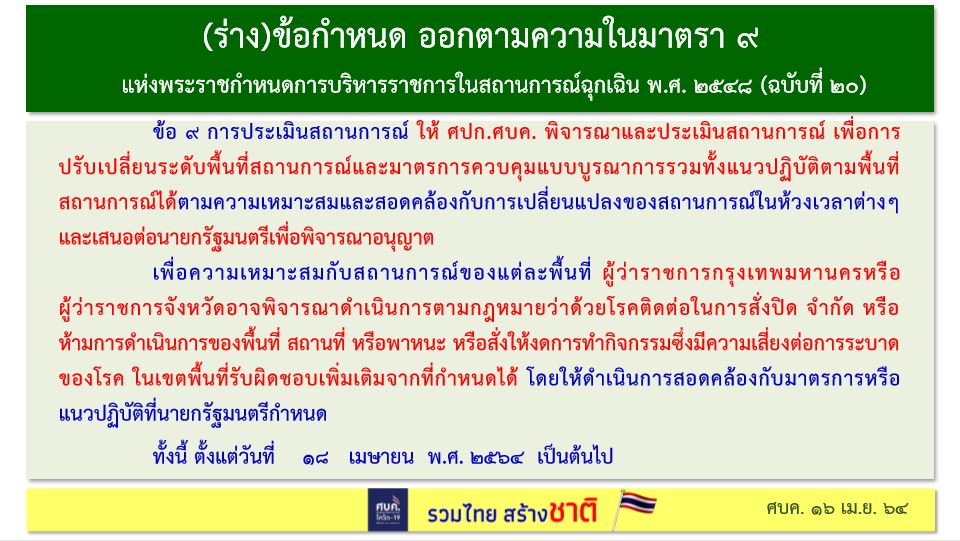 กทม. 16 เม.ย.-มติที่ประชุม ศบค.ชุดใหญ่ เห็นชอบให้ ปิดสถานบันเทิง ลดเคลื่อนย้าย ปรับเวลาเปิด-ปิดห้างร้าน “ไม่เคอร์ฟิว ไม่ล็อกดาวน์” ให้ปฏิบัติตามมาตรการพื้นที่สี เริ่มตั้งแต่ 18 เมษายน – 2 พฤษภาคม 2564.-สำนักข่าวไทย