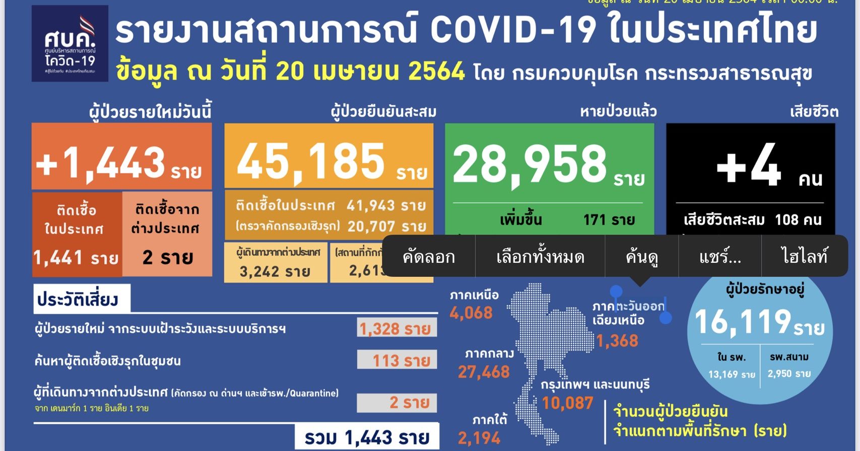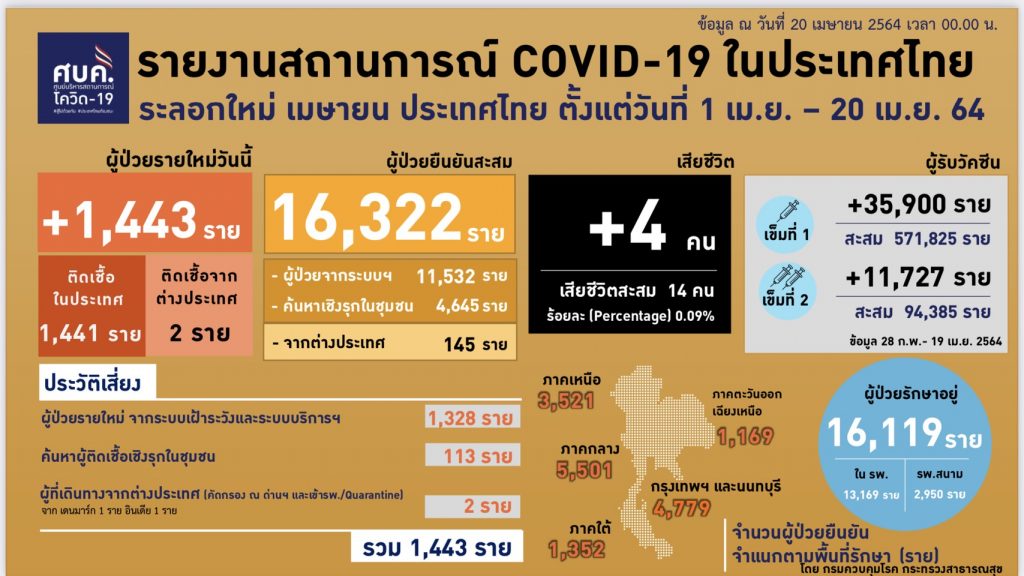 นพ.ทวีศิลป์ วิษณุโยธิน โฆษกศูนย์บริหารสถานการณ์การแพร่ระบาดของโรคติดเชื้อไวรัสโคโรน่า 2019 หรือ ศบค. รายงานตัวเลขผู้ติดเชื้อโควิด-19 วันนี้เพิ่มขึ้น 1,443 ราย ผู้ป่วยยืนยันสะสม 45,185 ราย หายป่วยแล้ว 28,958 ราย รักษาตัวอยู่ที่โรงพยาบาล 16,119 ราย เสียชีวิตเพิ่ม 4 คน ผู้เสียชีวิตสะสมรวม 108 คน ผู้ป่วยยืนยันสะสมรอกใหม่ ตั้งแต่วันที่ 1 เมษายน 2563 – 20 เมษายน 2564 จำนวน 16,322 ราย