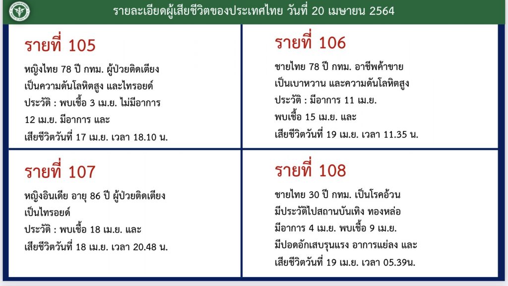 ทั้งนี้ผู้เสียชีวิต 4 ราย รายแรกเป็นหญิงไทย อายุ 78 ปี อยู่กรุงเทพฯ เป็นผู้ป่วยติดเตียง มีความดันโลหิตสูงและไทรอยด์ ตรวจพบเชื้อ วันที่ 3 เมษายน ไม่มีอาการ วันที่ 12 เมษายน เริ่มมีอาการ และเสียชีวิตวันที่ 17 เมษายน
