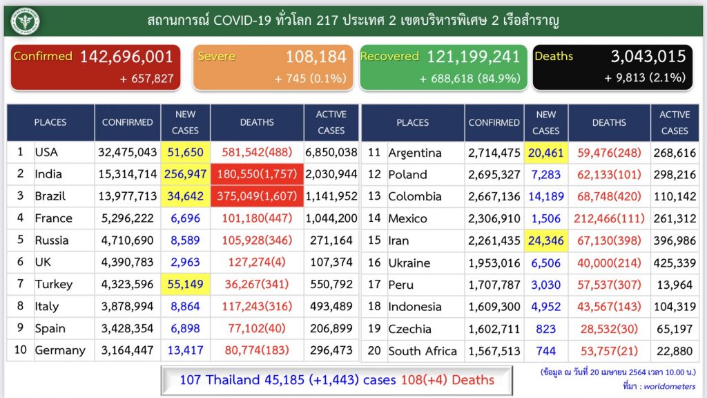 สถานการณ์ผู้ติดเชื้อทั่วโลก 142.6 ล้านราย เสียชีวิตสะสมทั่วโลก 3 ล้านคน สหรัฐอเมริกา ยังคงมีผู้ติดเชื้อสูงสุด 32.4 ล้านราย ตามด้วยอินเดีย 15.3 ล้านราย โดยมีผู้ติดเชื้อเพิ่มในรอบวัน 256,947 ราย บราซิล 13.9 ล้านราย ฝรั่งเศส 5.2 ล้านราย รัสเซีย 4.7 ล้านราย สหราชอาณาจักร 4.39 ล้านราย ประเทศไทยอยู่ลำดับที่ 107