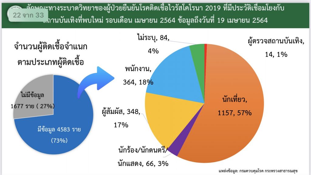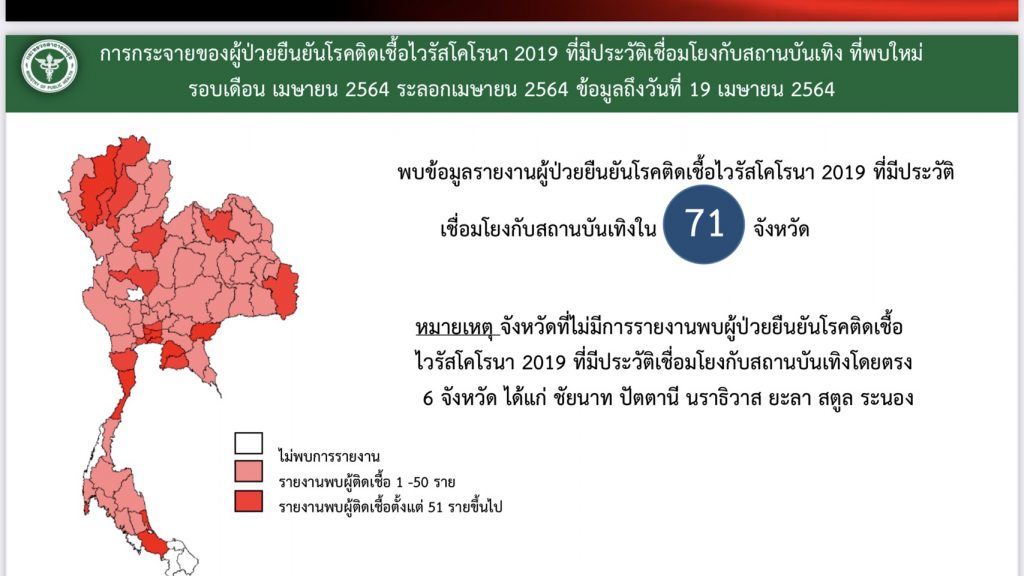 ในวันนี้ กระทรวงสาธารณสุข ได้รายงานสรุปสาเหตุการแพร่ระบาดกระรอกใหม่ที่มาจากสถานบันเทิง ต่อที่ประชุมศูนย์ปฏิบัติการศูนย์บริหารสถานการณ์โควิด-19 หรือ ศปก.ศบค. ว่าผู้ติดเชื้อระรอกใหม่ มีประวัติเชื่อมโยงกับสถานบันเทิงกระจายไปถึง 71 จังหวัด แต่มี 6 จังหวัด ที่ไม่มีรายงานผู้ป่วยยืนยันที่เชื่อมโยงกับสถานบันเทิงโดยตรง ได้แก่ จังหวัดชัยนาท ปัตตานี นราธิวาส ยะลา สตูล และระนอง และจากการสืบสวนโรค ผู้ป่วยให้ข้อมูลเพียงร้อยละ 73 ที่เหลือร้อยละ 27 ไม่ให้ข้อมูล โดยร้อยละ 57 เป็นนักเที่ยว พนักงานร้อยละ 18 และผู้สัมผัสร้อยละ 17
