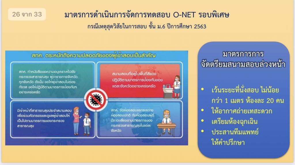 ส่วนมาตรการดำเนินการจัดสอบ o-net รอบพิเศษ เนื่องจากมีนักเรียนบางส่วนใน 5 จังหวัด รวมกว่า 100 คน ไม่สามารถสอบ o-net ครั้งที่ผ่านมาได้ โดยที่ประชุมอนุมัติให้ดำเนินการสอบได้