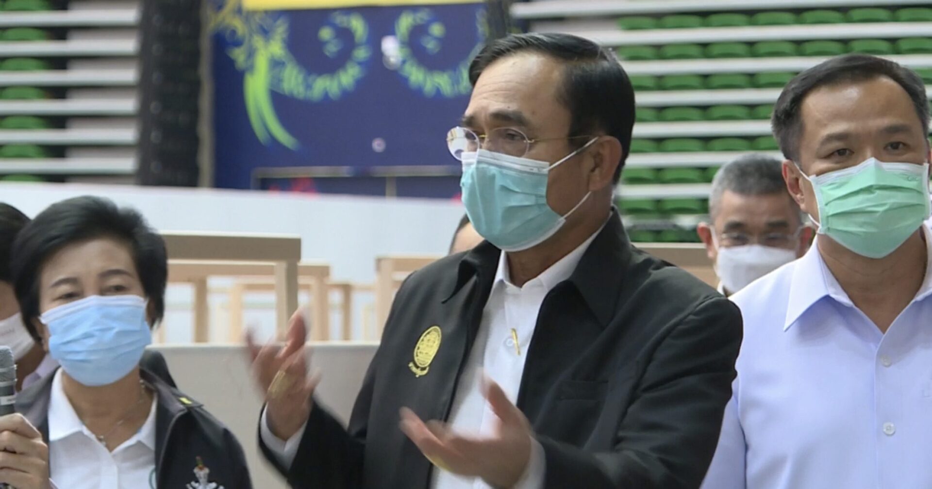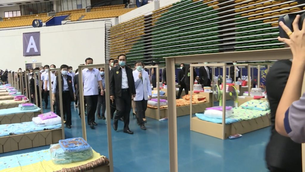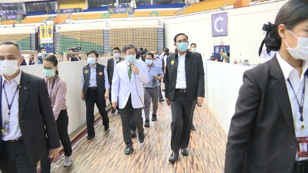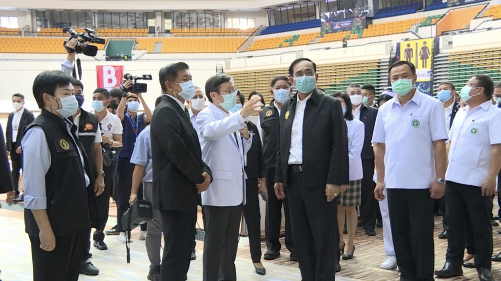 พล.อ.ประยุทธ์ จันทร์โอชา นายกรัฐมนตรีและรัฐมนตรีว่าการกระทรวงกลาโหม ลงพื้นที่ตรวจเยี่ยมความพร้อมโรงพยาบาลสนามเอราวัณ 2 ศูนย์กีฬาบางกอกอารีนา เขตหนองจอก กรุงเทพมหานคร ทันทีที่นายกรัฐมนตรีมาถึงได้รับฟังรายงานจากคณะทำงานเพื่อสรุปแนวทางของโรงพยาบาลสนาม