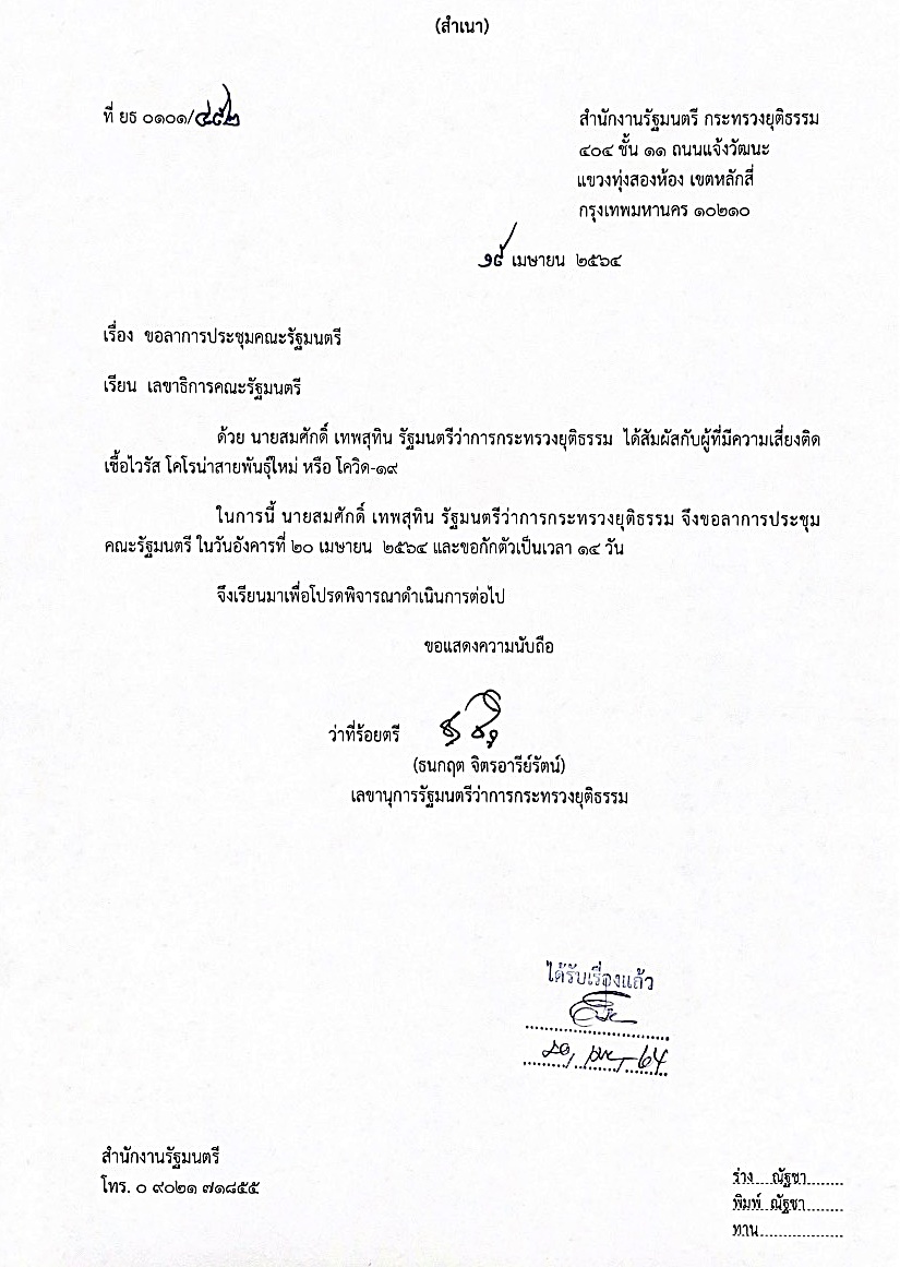 กรุงเทพฯ 21 เม.ย.-“สมศักดิ์” ตรวจหาโควิดผลเป็นลบ หลังร่วมโต๊ะอาหารคนติดเชื้อ ทำหนังสือลาประชุมครม.พร้อมขอกักตัว 14 วัน นัดตรวจรอบสอง 27 เม.ย.