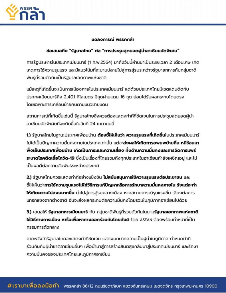 พรรคกล้า ออกแถลงการณ์ข้อเสนอถึงรัฐบาลไทยต่อการประชุมสุดยอดผู้นำอาเซียนนัดพิเศษ ในวันที่ 24 เมษายนนี้ ที่สำนักเลขาธิการอาเซียน กรุงจาการ์ตา ประเทศอินโดนีเซีย โดยมีเนื้อหาว่าการรัฐประหารในประเทศเมียนมา ผ่านมาเป็นระยะเวลา 2 เดือนเศษ เกิดเหตุการใช้ความรุนแรง และมีแนวโน้มที่จะบานปลายไปสู่การสู้รบระหว่างรัฐบาลทหารกับกลุ่มชาติพันธุ์ที่รวมตัวกันเป็นรัฐบาลเอกภาพแห่งชาติ แม้เหตุที่เกิดขึ้นจะเป็นการเมืองภายในประเทศเมียนมา แต่ด้วยไทยมีเขตแดนติดกับประเทศเมียนมาร์ถึง 2,401 กิโลเมตร มีจุดผ่านแดน 16 จุด ย่อมได้รับผลกระทบโดยตรง โดยเฉพาะการเคลื่อนย้ายคนตามแนวชายแดน