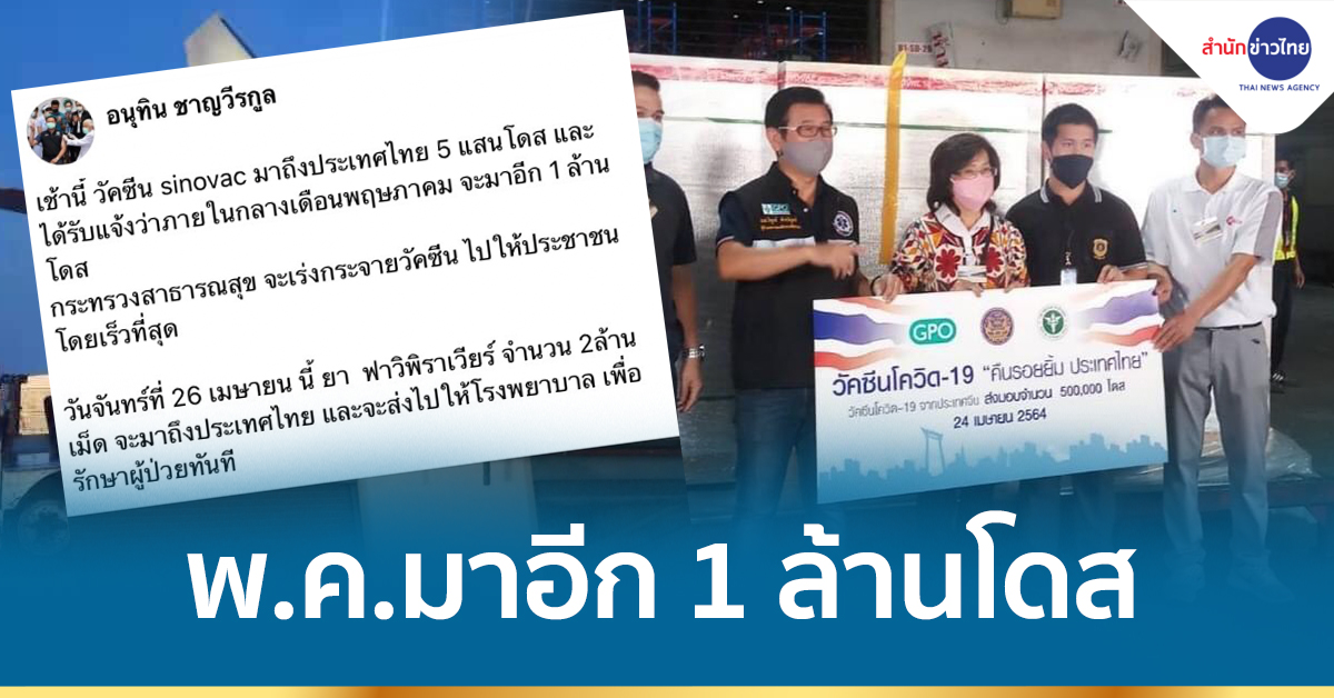 เช้านี้ วัคซีน sinovac มาถึงประเทศไทย 5 แสนโดส และ ได้รับแจ้งว่าภายในกลางเดือนพฤษภาคม จะมาอีก 1 ล้านโดส…โพสต์โดย อนุทิน ชาญวีรกูล เมื่อ วันศุกร์ที่ 23 เมษายน 2021