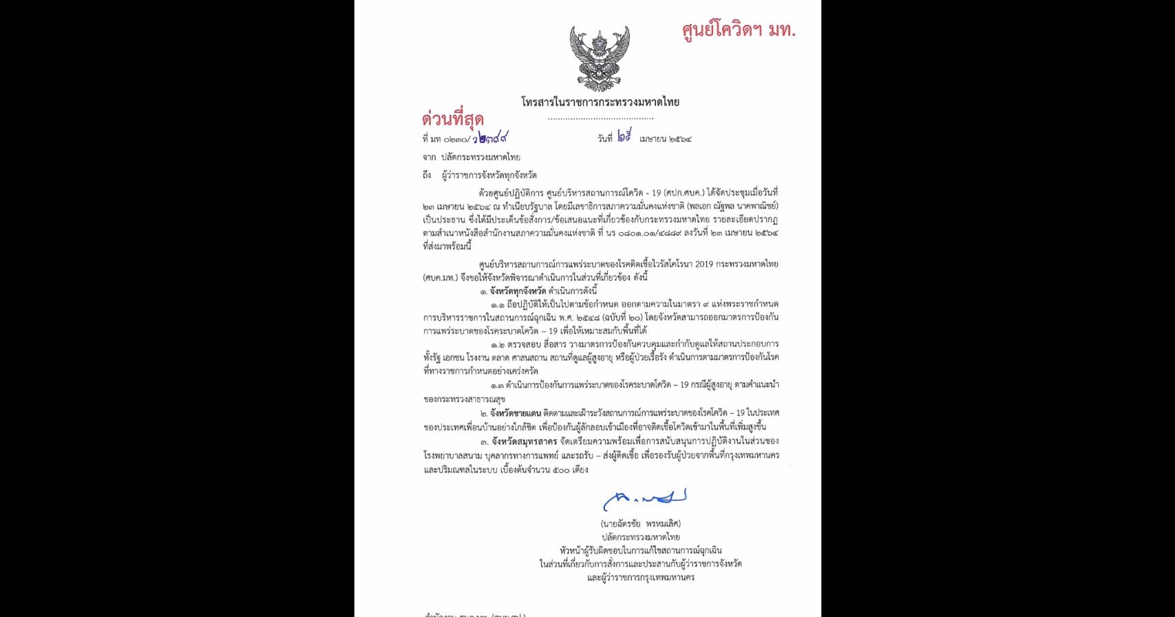 นายฉัตรชัย พรหมเลิศ ปลัดกระทรวงมหาดไทย ในฐานะหัวหน้าผู้รับผิตชอบในการแก้ไขสถานการณ์ฉุกเฉินในส่วนที่เกี่ยวกับการสั่งการและประสานกับผู้ว่าราชการจังหวัดและผู้ว่าราชการกรุงเทพมหานคร ทำหนังสือด่วนถึงผู้ว่าราชการทุกจังหวัด ตามที่ศูนย์ปฏิบัติการศูนย์บริหารสถานการณ์โควิด-19 หรือ ศปก.ศบค. ประชุมเมื่อวันที่ 23 เม.ย.ที่ผ่านมา โดยมี พล.อ.ณัฐพล นาคพาณิชย์ เลขาธิการสภาความมั่นคงแห่งชาติ เป็นประธาน ซึ่งได้มีประเด็นข้อสั่งการ ข้อเสนอแนะที่เกี่ยวข้องกับกระทรวงมหาดไทย ดังนั้น ศบค.กระทรวงมหาดไทย จึงขอให้จังหวัดพิจารณาดำเนินการในส่วนที่เกี่ยวข้อง คือ