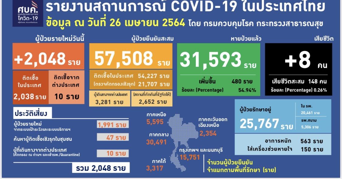พญ.อภิสมัย ศรีรังสรรค์ ผู้ช่วยโฆษกศูนย์บริหารสถานการณ์ฉุกเฉิน (ศบค.) แถลงสถานการณ์ประจำวันว่า พบผู้ติดเชื้อรายใหม่ 2,048 ราย แบ่งเป็นติดเชื้อในประเทศ 2,038 รายและติดเชื้อจากต่างประเทศ 10 ราย ผู้ป่วยยืนยันสะสม 57,508 ราย หายป่วยแล้ว 31,593 ราย รักษาอยู่ 25,767 ราย แบ่งเป็นในโรงพยาบาล 20,461 ราย และ โรงพยาบาลสนาม 5,306 ราย มีผู้ป่วยอาการหนัก 563 ราย และใส่เครื่องช่วยหายใจ 150 ราย ผู้เสียชีวิตเพิ่ม 8 ราย รวมเสียชีวิตสะสม 148 คน