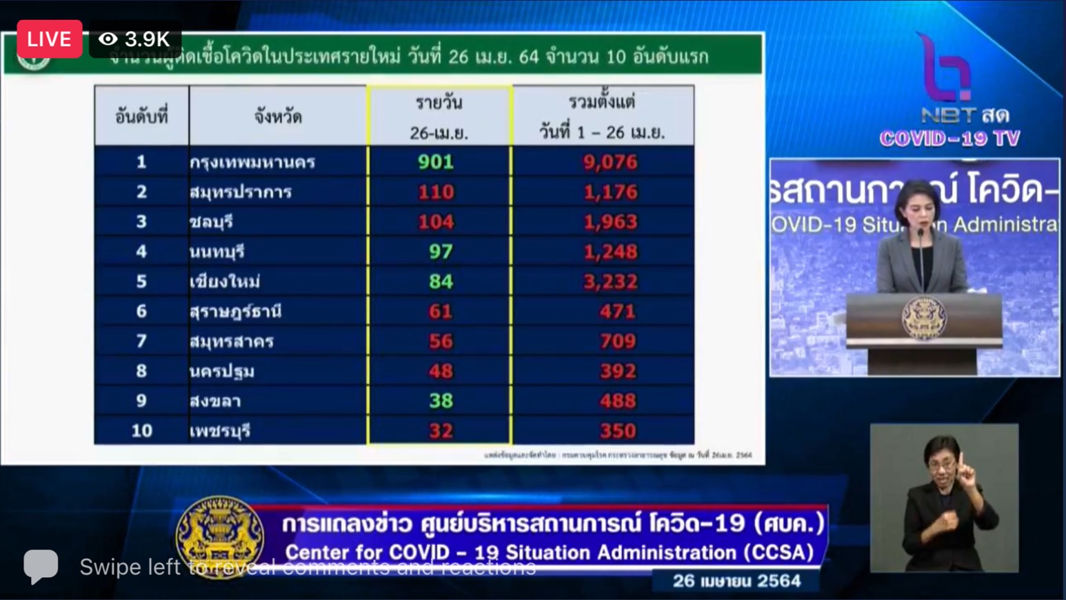 ทำเนียบรัฐบาล 26 เม.ย.-ศบค.เผยตัวเลขผู้ติดเชื้อรายใหม่ 2,048 เสียชีวิตเพิ่ม 8 ราย เตรียมจัดส่งยาฟาวิพิราเวียร์ให้ รพ.ทั่วประเทศ เปิดโรงพยาบาลสนามที่สมุทรสาคร ขออย่าปกปิดไทม์ไลน์ ทำบุคลากรทางการแพทย์ติดเชื้อ กักตัวจำนวนมาก