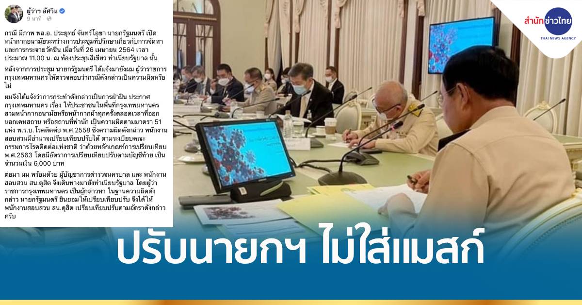 กทม. 26 เม.ย. – ผู้ว่าฯ กทม. นำตำรวจ สน.ดุสิต ปรับนายกรัฐมนตรี 6,000 บาท ผิด พ.ร.บ.โรคติดต่อ ไม่ใส่หน้ากากอนามัยระหว่างประชุม