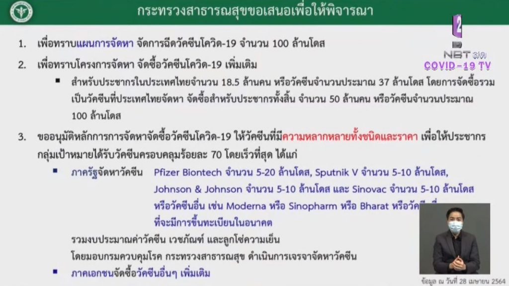 กระทรวงสาธารณสุขขอเสนอให้พิจารณาใน 3 ข้อคือ 1.แผนการจัดหา การจัดฉีดวัคซีน โควิด-19 จำนวน 100 ล้านโดส 2.ทราบโครงการการจัดหา จัดซื้อวัคซีน โควิด-19 เพิ่มเติม สำหรับประชากรในประเทศไทยจำนวน 18.5 ล้านคนหรือ 37 ล้านโดส โดยการจัดซื้อรวมเป็นวัคซีนที่ประเทศไทยจัดหาจัดซื้อสำหรับประชากรทั้งสิ้นจำนวน 50 ล้านคนหรือวัคซีนจำนวน 100 ล้านโดส และ3.ขออนุมัติหลักการ ให้ทางภาครัฐและเอกชน จัดหาจัดซื้อวัคซีน โควิด-19 ให้วัคซีนที่มีความหลากหลายทั้งชนิดและราคา เพื่อให้ประชากรกลุ่มเป้าหมายได้รับวัคซีนครอบคลุมร้อยละ 70 โดยเร็วที่สุด โดยภาครัฐจัดหาวัคซีน ไฟเซอร์จำนวน 5-20 ล้านโดส สปุตนิกวี จำนวน 5-10 ล้านโดส Johnson & Johnson จำนวน 5-10 ล้านโดส และซิโนแวค 5-10 ล้านโดส หรือวัคซีนอื่นเช่น โมเดิร์นนา ซีโนฟาร์ม หรือบารัท หรือวัคซีนอื่นที่จะมีการขึ้นทะเบียนในอนาคต โดยภาคเอกชนไม่ได้ถูกตัดออกจากความร่วมมือ ยังสามารถที่จะร่วมจัดซื้อได้