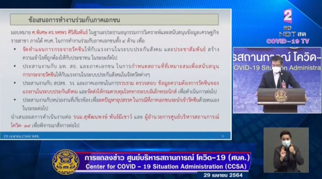 โดยข้อสรุป ทางคณะกรรมการร่วมภาคเอกชน 3 สถาบัน (กกร.) ได้ให้มอบหมายให้ นายทศพร ศิริสัมพันธ์ ในฐานะประธานอนุกรรมการวิเคราะห์และสนับสนุนข้อมูลเศรษฐกิจรายสาขาภายใต้ คณะกรรมการบริหารสถานการณ์เศรษฐกิจ ทำงานร่วมกับภาคเอกชน 4 ด้านคือ 1.การจัดทำแผนกระจายวัคซีนให้กับแรงงานในระบบประกันสังคมและประชาสัมพันธ์สร้างความเข้าใจที่ถูกต้องให้กับประชาชนในระยะถัดไป 2.ประสานงานกับกระทรวงมหาดไทย กระทรวงสาธารณสุข และภาคเอกชนในการกำหนดสถานที่ที่เหมาะสมเพื่อสนับสนุนการกระจายวัคซีนให้กับแรงงานในระบบประกันสังคมในจังหวัดต่างๆ 3 ประสานงานกับ สปสช. แรงงาน และภาคเอกชนในการรวบรวมตรวจสอบข้อมูลความต้องการวัคซีนของแรงงานในระบบประกันสังคม และจัดส่งให้กรมควบคุมโรคทางระบบอิเล็กทรอนิกส์ เพื่อดำเนินการต่อไป และ4. ประสานงานกับหน่วยงานที่เกี่ยวข้องเพื่อลดปัญหาอุปสรรค ในกรณีที่ภาคเอกชนจะนำเข้าวัคซีนด้วยตนเองในระยะต่อไป โดยจะนำเสนอผลการดำเนินงานต่อนายสุพัฒนพงษ์ พันธ์มีเชาว์ รองนายกรัฐมนตรี และรัฐมนตรีว่าการกระทรวงแรงงาน และผู้อำนวยการศูนย์สถานการณ์ โควิด-19 ต่อไป