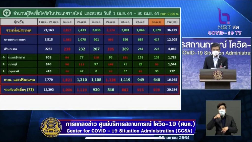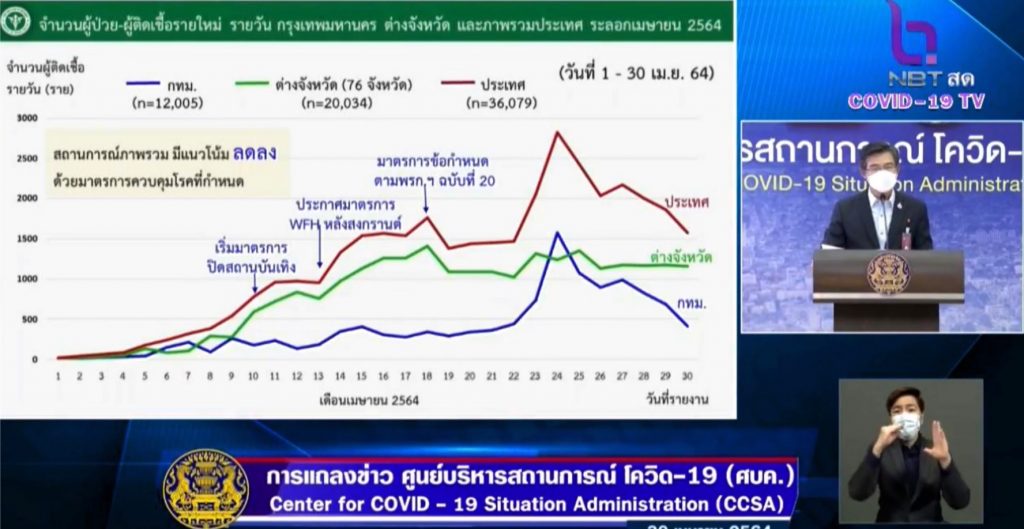 นพ.ทวีศิลป์ วิษณุโยธิน โฆษกศูนย์บริหารสถานการณ์การแพร่ระบาดของโรคติดเชื้อไวรัสโคโรนา 2019 (ศบค.) กล่าวว่า วันนี้(30 เม.ย.) ตัวเลขผู้ติดเชื้อรายใหม่ลดลงอยู่ที่ 1,583 ราย แต่ก็ยังไม่น่าดีใจ และยังมีความน่ากังวลอยู่ โดยเฉพาะในพื้นที่ กทม. ที่แม้ตัวเลขผู้ติดเชื้อลดลง แต่ผู้ติดเชื้อที่มีอาการหนักและผู้ที่ใส่ท่อช่วยหายใจ รวมถึงผู้เสียชีวิตที่มีจำนวนเพิ่มขึ้น ซึ่งคล้องกับการหาเตียงของคนไข้ ที่มีจำนวนเพิ่มขึ้นเช่นกัน ทั้งหมดสืบเนื่องมาจากจำนวนผู้ติดเชื้อที่มากกว่า 2,000 คนในช่วงที่ผ่านมา ถ้าสามารถปรับตัวเลข กทม. ให้ลดลงได้ เชื่อว่าตัวเลขผู้ติดเชื้อทั้งประเทศจะลดลงด้วย