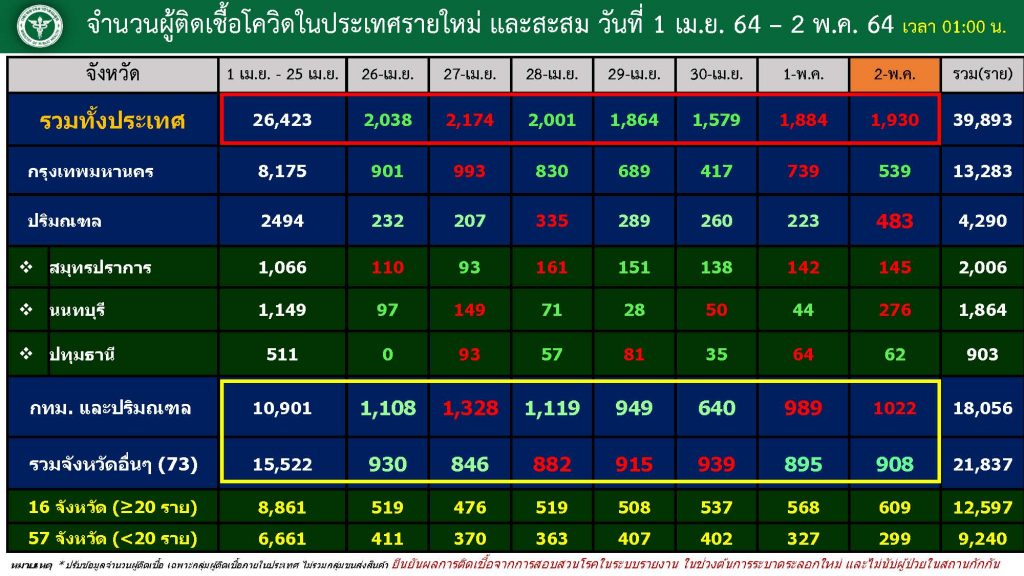 กทม. 2 พ.ค. – ศบค.เผยยอดติดเชื้อวันนี้ 1,940 ราย ยอดตายยังสูง 21 ราย ยันอัตรารอเตียงลดลง ส่วนการจองวัคซีนหมอพร้อม รวม 2 วันอยู่ที่ 430,588 ราย