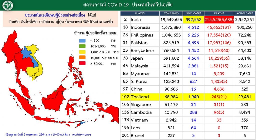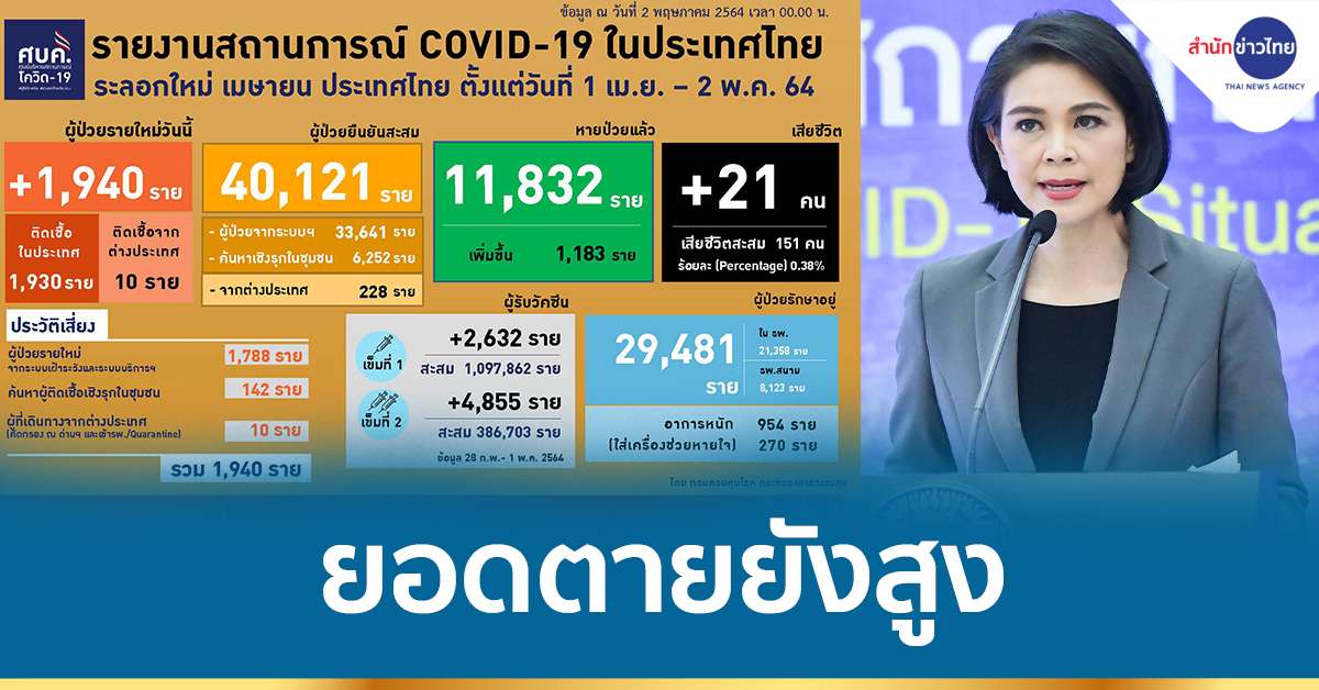 แพทย์หญิงอภิสมัย กล่าวว่าหลายประเทศในเอเชียได้พูดคุยถึงการกลายพันธุ์ของเชื้อสายพันธุ์อินเดีย โดยที่มาเลเซียมีผู้ติดเชื้อ 2,800 ราย สิงคโปร์ 34 ราย กัมพูชา 388 ราย เวียดนาม 14 ราย ลาว 64 ราย ส่วนที่ประเทศไทย มีผู้ติดเชื้อรายใหม่อีก 1,940 ราย ทำให้มียอดผู้ป่วยยืนยันสะสมแล้วจนถึงวันนี้ 68,984 ราย มียอดผู้เสียชีวิตเพิ่มขึ้นอย่างต่อเนื่อง วันนี้มีผู้เสียชีวิตเพิ่มอีก 21 ราย ทำให้มียอดผู้เสียชีวิตสะสม 245 ราย โดยในวันนี้ (2พ.ค.) ผู้เสียชีวิต เป็นชาว กทม. 8 ราย เชียงใหม่ 4 ชลบุรี และลำพูนจังหวัดละ 2 ราย ส่วนนครปฐม ตาก ระยอง นครสวรค์ และอุดรธานี จังหวัดละ 1 ราย ผู้เสียชีวิตส่วนใหญ่ติดเชื้อจากสมาชิกในครอบครัว เพื่อนฝูงเพื่อนร่วมงาน เป็นผู้ป่วยที่มีโรคประจำตัว ความดันโลหิตสูง เบาหวาน โรคหัวใจ ไขมันในเลือดสูง หลอดเลือดสมอง มะเร็ง อ้วน ปอด ไต เรื้อรัง และเป็นผู้ป่วยติดเตียง 3 ราย