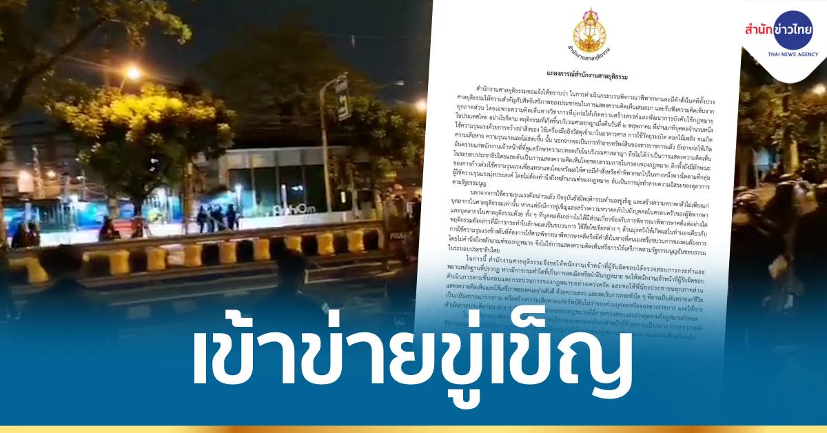 วันนี้ (3 พ.ค.) สำนักงานศาลยุติธรรมออกแถลงการณ์ ขอแจ้งให้ทราบว่า ในการดำเนินกระบวนพิจารณาพิพากษาและมีคำสั่งในคดีทั้งปวง ศาลยุติธรรมให้ความสำคัญกับสิทธิเสรีภาพของประชาชนในการแสดงความคิดเห็นเสมอมา และรับฟังความคิดเห็นจากทุกภาคส่วน โดยเฉพาะความคิดเห็นทางวิชาการที่มุ่งก่อให้เกิดความสร้างสรรค์และพัฒนาการบังคับใช้กฎหมายในประเทศไทย อย่างไรก็ตาม พฤติกรรมที่เกิดขึ้นบริเวณศาลอาญาเมื่อคืนวันที่ 2 พฤษภาคมที่ผ่านมา ที่บุคคลจำนวนหนึ่ง ใช้ความรุนแรงด้วยการขว้างปาสิ่งของ ใช้เครื่องมือยิงวัสดุเข้ามาในอาคารศาล การใช้วัตถุระเบิด ดอกไม้เพลิง จนเกิดความเสียหาย ความรุนแรงและไม่สงบขึ้น นั้น นอกจากจะเป็นการทำลายทรัพย์สินของทางราชการแล้ว ยังอาจก่อให้เกิดอันตรายแก่พนักงานเจ้าหน้าที่ที่ดูแลรักษาความปลอดภัยในบริเวณศาลอาญา ถือไม่ได้ว่าเป็นการแสดงความคิดเห็นในระบอบประชาธิปไตยและอันเป็นการแสดงความคิดเห็นโดยชอบธรรมภายในกรอบของกฎหมาย อีกทั้งยังมีลักษณะของการก้าวล่วงใช้ความรุนแรงเพื่อแทรกแซง โดยหวังผลให้ศาลมีคำสั่งหรือคำพิพากษาไปในทางหนึ่งทางใดตามที่กลุ่มผู้ใช้ความรุนแรงมุ่งประสงค์ โดยไม่ต้องคำนึงถึงหลักเกณฑ์ของกฎหมาย อันเป็นการมุ่งทำลายความอิสระของตุลาการตามรัฐธรรมนูญ