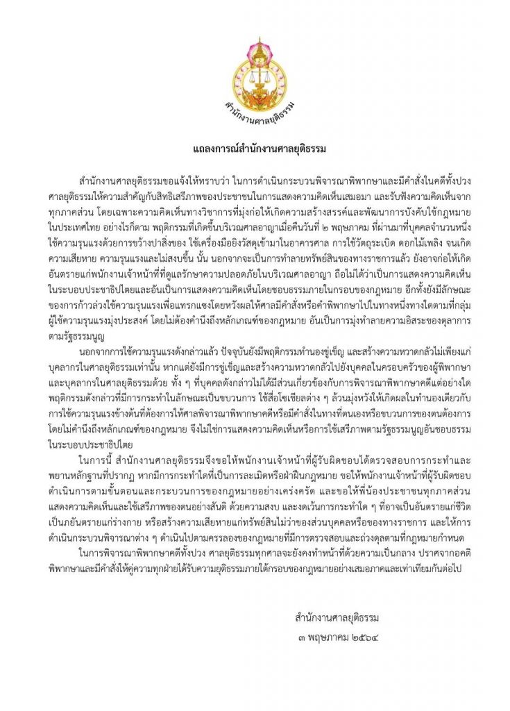 ในการนี้ สำนักงานศาลยุติธรรม จึงขอให้พนักงานเจ้าหน้าที่ผู้รับผิดชอบได้ตรวจสอบการกระทำและพยานหลักฐานที่ปรากฏ หากมีการกระทำใดที่เป็นการละเมิดหรือฝ่าฝืนกฎหมาย ขอให้พนักงานเจ้าหน้าที่ผู้รับผิดชอบดำเนินการตามขั้นตอนและกระบวนการของกฎหมายอย่างเคร่งครัด และขอให้พี่น้องประชาชนทุกภาคส่วน แสดงความคิดเห็นและใช้เสรีภาพของตนอย่างสันติ ด้วยความสงบ และงดเว้นการกระทำใดๆ ที่อาจเป็นอันตรายแก่ชีวิต เป็นภยันตรายแก่ร่างกาย หรือสร้างความเสียหายแก่ทรัพย์สินไม่ว่าของส่วนบุคคลหรือของทางราชการ และให้การดำเนินกระบวนพิจารณาต่างๆ ดำเนินไปตามครรลองของกฎหมายที่มีการตรวจสอบและถ่วงดุลตามที่กฎหมายกำหนด