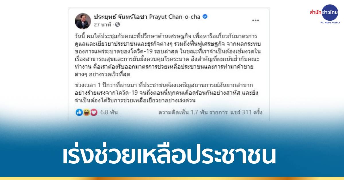 พล.อ.ประยุทธ์ จันทร์โอชา นายกรัฐมนตรี โพสต์เฟซบุ๊ก เผยวันนี้ ได้ประชุมกับคณะที่ปรึกษาด้านเศรษฐกิจ เพื่อหารือเกี่ยวกับมาตรการดูแลและเยียวยาประชาชนและธุรกิจต่างๆ รวมถึงฟื้นฟูเศรษฐกิจ จากผลกระทบของการแพร่ระบาดของโควิด-19 รอบล่าสุด ในขณะที่เราจำเป็นต้องเข้มงวดในเรื่องสาธารณสุขและการยับยั้งควบคุมโรคระบาด สิ่งสำคัญที่ผมเน้นย้ำกับคณะทำงาน คือเราต้องรีบออกมาตรการช่วยเหลือประชาชนและการทำมาค้าขายต่างๆ อย่างรวดเร็วที่สุด