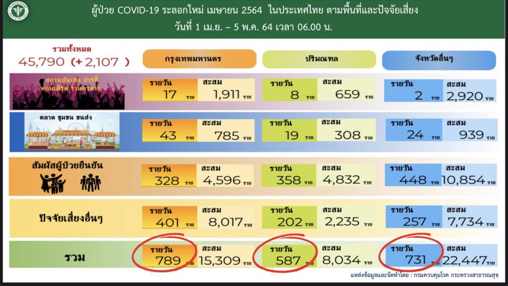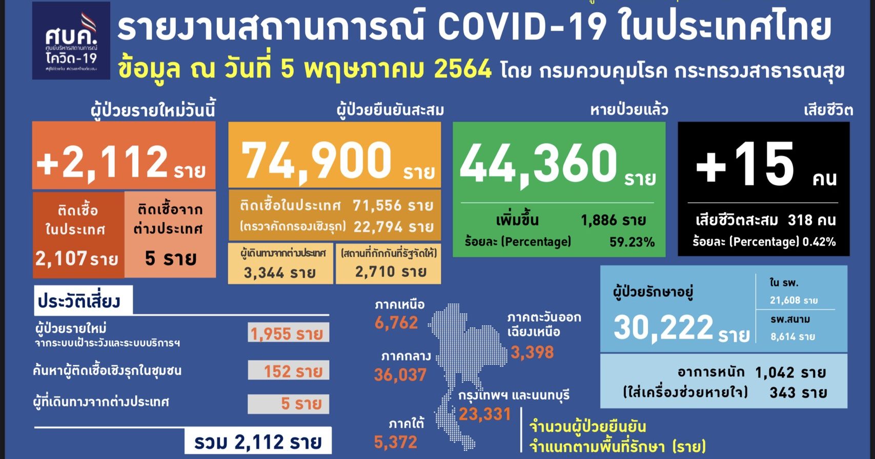 ทำเนียบรัฐบาล 5 พ.ค. – ศบค.เผยผู้ติดเชื้อโควิด-19 รายใหม่ 2,112 คน เสียชีวิต 15 ราย ป่วยหนักกว่า 1,000 คน ปัจจัยเสี่ยงจากคนในครอบครัว เดินหน้าตรวจเชิงรุกในกรุงเทพฯ และปริมณฑล เตรียมกระจายวัคซีนฉีดกลุ่มเสี่ยงใน กทม. วันละ 60,000 ราย