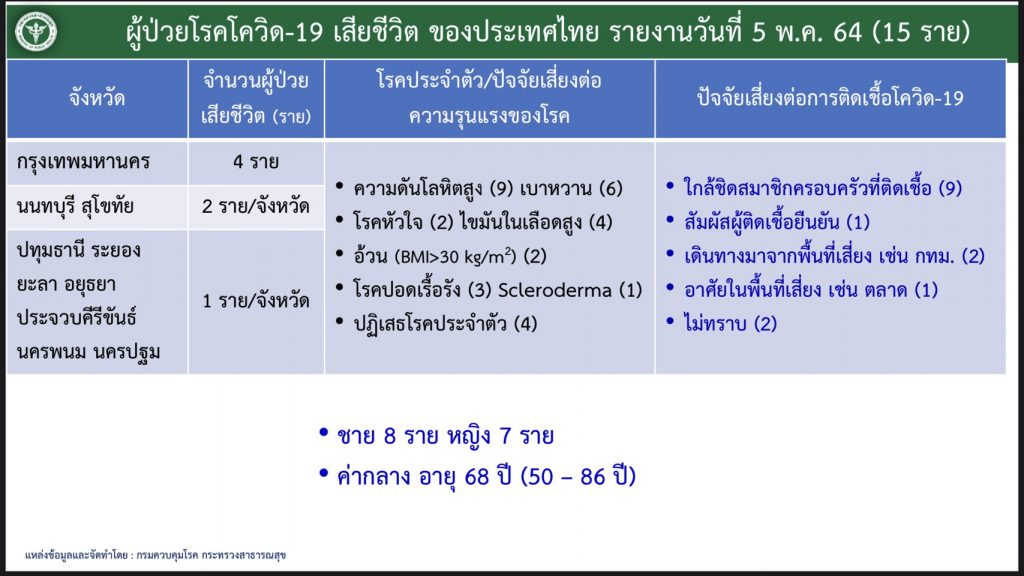 สำหรับรายละเอียดผู้เสียชีวิตมีอายุ 50-86 ปี เป็นชาย 8 ราย หญิง 7 ราย ส่วนใหญ่มีโรคประจำตัว อยู่ในพื้นที่ กทม. 4 ราย นนทบุรี สุโขทัย จังหวัดละ 2 ราย ปทุมธานี ระยอง ยะลา อยุธยา ประจวบคีรีขันธ์ นครพนม และ นครปฐม จังหวัดละ 1 ราย โดยมีปัจจัยมาจากการใกล้ชิดสมาชิกในครอบครัวที่ติดเชื้อ 9 ราย สัมผัสผู้ติดเชื้อยืนยัน 1 ราย เดินทางมาจากพื้นที่เสี่ยง เช่น กทม. 2 ราย อาศัยในพื้นที่เสี่ยง เช่น ตลาด 1 ราย และไม่ทราบว่าติดเชื้อ 2 ราย ทั้งนี้พบว่าในจำนวนนี้มี 1 ราย เดินทางมาที่โรงพยาบาลโดยไม่รู้ว่าติดเชื้อโควิด-19 ซึ่งทีมแพทย์ให้การดูแล ผลตรวจพบว่าติดเชื้อและเสียชีวิตในเวลาเดียวกัน