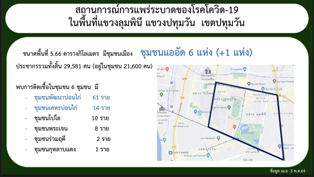 พญ.อภิสมัย กล่าวอีกว่า ผลการประชุมศบค. เกี่ยวกับพื้นที่กรุงเทพมหานครและปริมณฑล มีการจัดตั้งศูนย์เฉพาะกิจบริการสถานการณ์ในทุกเขตในกทม. มีการค้นหาเชิงรุกเพิ่มเติมต่อเนื่อง ในชุมชนแขวงลุมพินีและแขวงปทุมวัน เขตปทุมวัน 6 ชุมชน และ 1 เคหะ พบติดเชื้อ 162 คน โดยทั้งหมดส่งต่อเข้ารักษาตัวหมดแล้ว กักตัวผู้สัมผัสเสี่ยงสูงอีก 304 คน กรณีการพบผู้ป่วยจะส่งต่อไปยังศูนย์คัดแยกผู้ป่วย และส่งต่อผู้ป่วยไปยังสถานพยาบาลต่างๆ มีการลงตรวจค้นหาเชิงรุกควบคู่กับการกระจายวัคซีนในพื้นที่สัปดาห์นี้จะมีดูแนวทางการฉีดวัคซีนกลุ่มเสี่ยงในกรุงเทพมหานครด้วย คาดว่าต้องฉีดราววันละ 60,000 คนต่อวัน