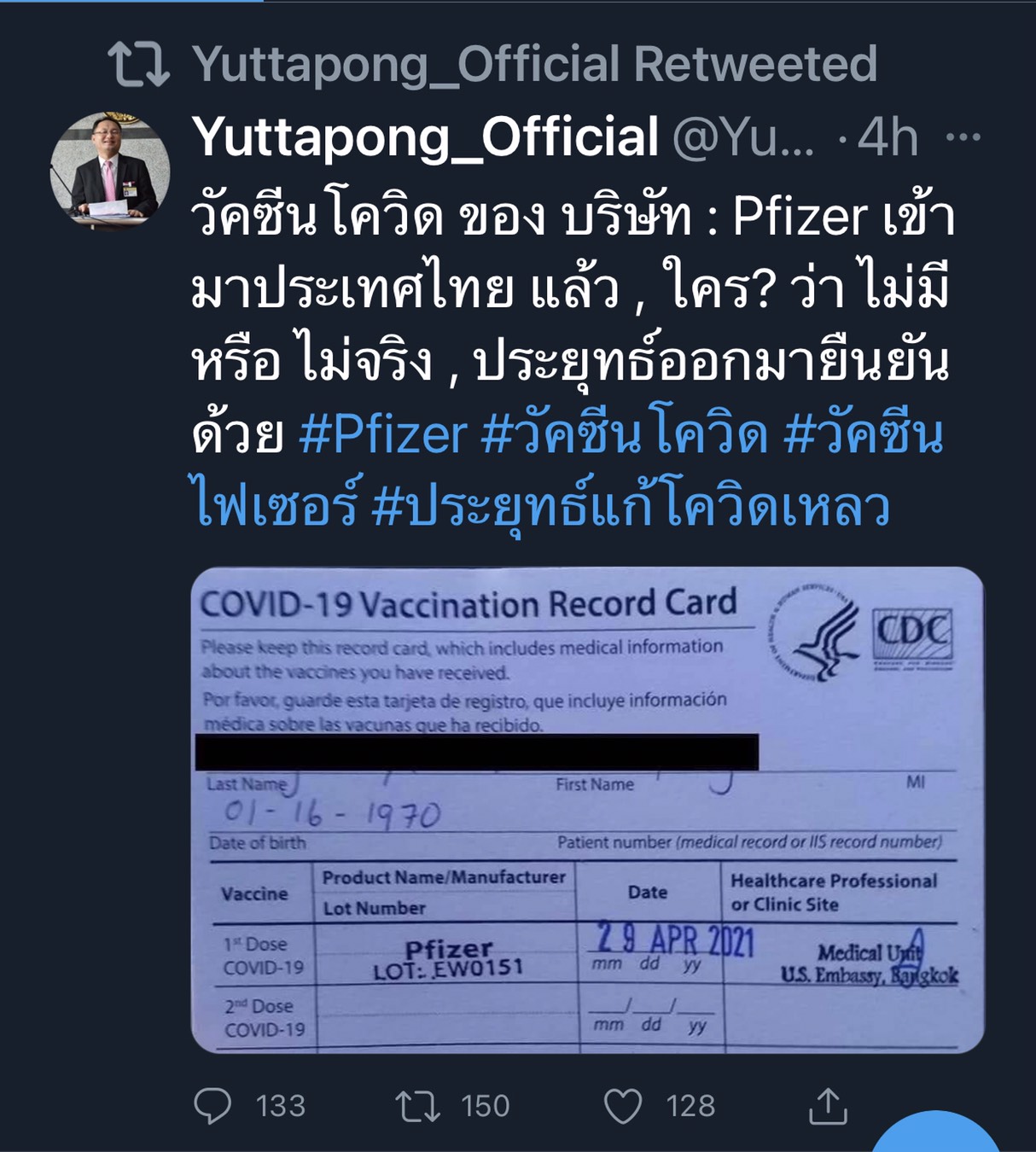 กรุงเทพฯ 6 พ.ค.-“ยุทธพงศ์” โพสต์โชว์ใบบันทึกฉีดวัคซีนไฟเซอร์มีจริงในไทย ขณะที่ผู้ใช้ทวิตเตอร์รุมตำหนิ ชี้เป็นการฉีดให้จนท.สถานทูตสหรัฐเท่านั้น ไม่ใช่ประชาชนทั่วไป