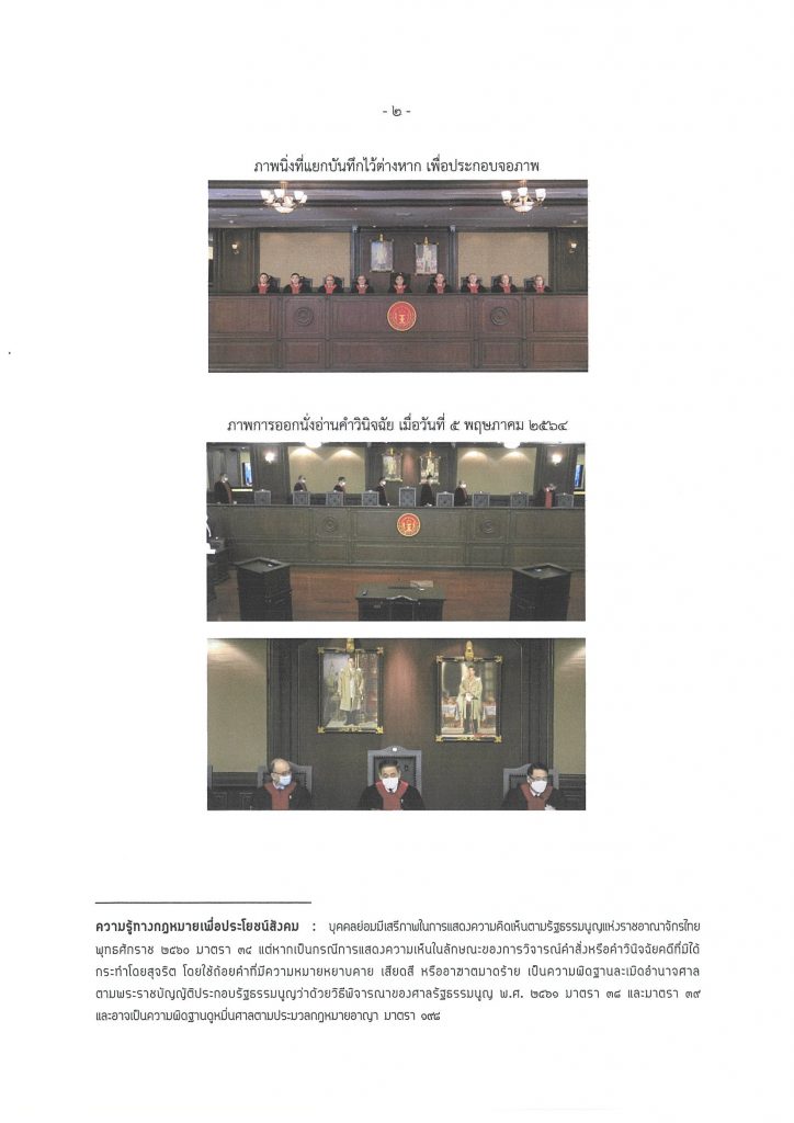 เพื่อความเข้าใจที่ถูกต้องตรงกันกับข้อเท็จจริง สำนักงานศาลรัฐธรรมนูญ ขอชี้แจงว่าภาพนิ่งดังกล่าวไม่ใช่ภาพในขณะที่ศาลกำลังปฏิบัติหน้าที่อ่านคำวินิจฉัยในคดีดังกล่าวแต่อย่างใด หากแต่เป็นภาพที่ได้มีการบันทึกไว้ในวาระโอกาสอื่น และนำมาใช้เฉพาะวัตถุประสงค์สำหรับประกอบการถ่ายทอดโทรทัศน์วงจรปิดในช่วงเวลาที่ทำการตัดภาพการถ่ายทอดให้มีเฉพาะเสียงการอ่านคำวินิจฉัยของตุลาการศาลรัฐธรรมนูญที่ได้รับมอบหมายเท่านั้น จึงขอเรียนว่าในขณะที่ศาลทำการอ่านคำวินิจฉัยอยู่นั้น คณะตุลาการศาลรัฐธรรมนูญทุกท่าน ได้สวมหน้ากากอนามัย ซึ่งได้ปฏิบัติตามมาตรการควบคุมการแพร่ระบาดของเชื้อโควิด-19 อย่างเคร่งครัดตลอดเวลา จนภารกิจดังกล่าว เสร็จสิ้นในเวลา 15.30 น. –สำนักข่าวไทย