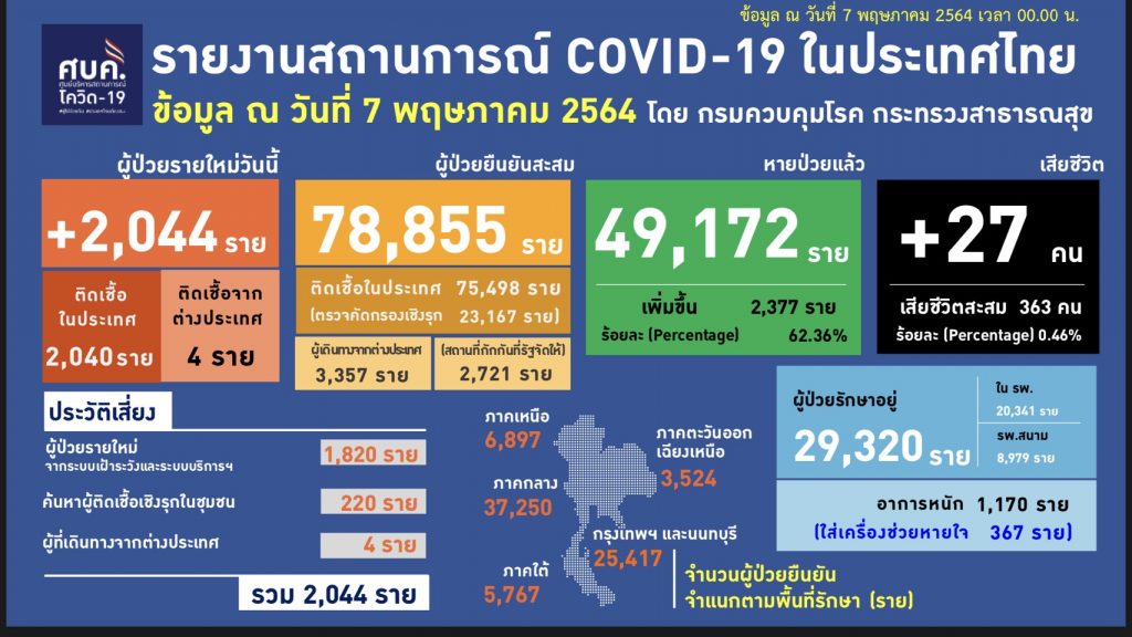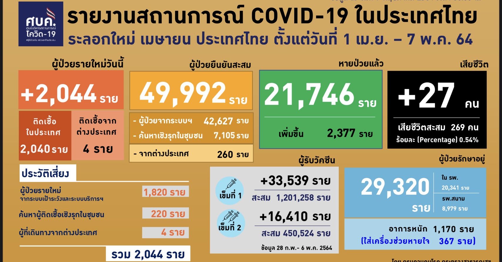 ทำเนียบรัฐบาล 7 พ.ค.- ศบค. เผยผู้ติดเชื้อรายใหม่ 2,044 ราย เสียชีวิตเพิ่ม 27 ราย อาการหนัก 1,170 ราย กทม.ติดเชื้อเพิ่ม 869 ราย