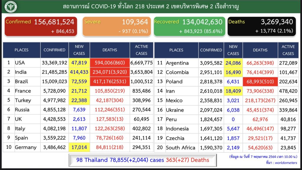 ส่วนสถานการณ์การระบาดของไวรัสโควิด-19 ทั่วโลกล่าสุดวันนี้(7พ.ค.) มียอดผู้ติดเชื้อสะสมรวมแล้ว 156,681,524 ราย เสียชีวิต 3,269,340 ราย โดยประเทศที่มียอดผู้ติดเชื้อสูงสุด อันดับแรก สหรัฐอเมริกา 33,369,192 ราย อันดับสอง อินเดีย 21,485,285 ราย อันดับสาม บราซิล 15,009,023 ราย โดยประเทศไทยอยู่ในอันดับที่ 98.-สำนักข่าวไทย.