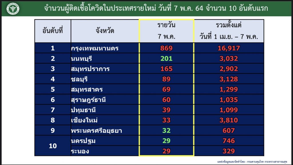 พญ.พรรณประภา กล่าวว่า 10 จังหวัดอันดับแรกที่พบผู้ติดเชื้อโควิด-19 สูงสุดได้แก่ กทม.869 ราย นนทบุรี 201 ราย สมุทรปราการ 165 ราย ชลบุรี 89 ราย สมุทรสาคร 69 ราย สุราษฎร์ธานี 60 ราย ปทุมธานี 39 ราย เชียงใหม่ 33 ราย อยุธยา 32 ราย นครปฐม 29 ราย และระนอง 29 ราย