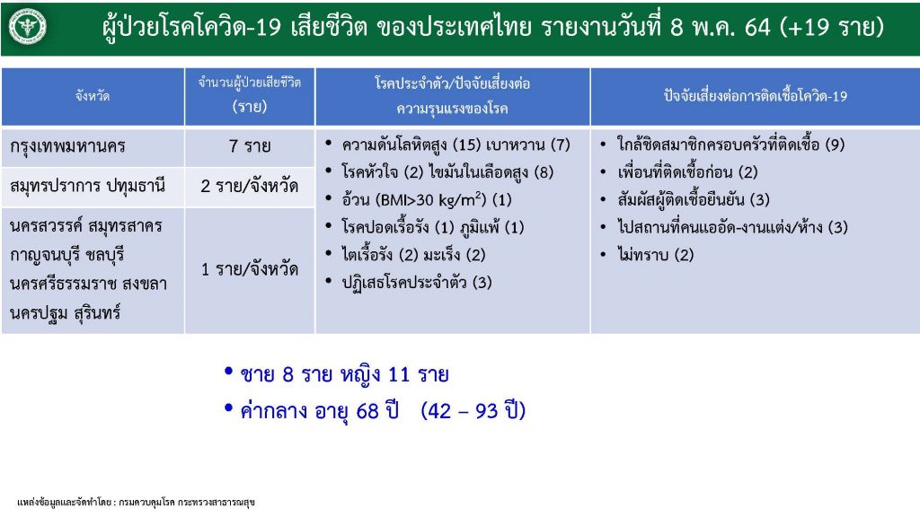 สำหรับผู้เสียชีวิตทั้ง 19 ราย เป็นชาย 8 ราย หญิง 11 ราย อยู่ใน กทม. 7 ราย สมุทรปราการ ปทุมธานี จังหวัดละ 2 ราย นครสวรรค์ สมุทรสาคร กาญจนบุรี ชลบุรี นครศรีธรรมราช สงขลา นครปฐม และสุรินทร์ จังหวัดละ 1 ราย ส่วนมากมีโรคประจำตัวความดันโลหิตสูงเบาหวาน ปัจจัยเสี่ยงต่อการติดเชื้อโควิด-19 คือ จากสัมผัสผู้ติดเชื้อที่เป็นคนในครอบครัว อายุน้อยสุด 42 ปี อายุมากสุด 93 ปี
