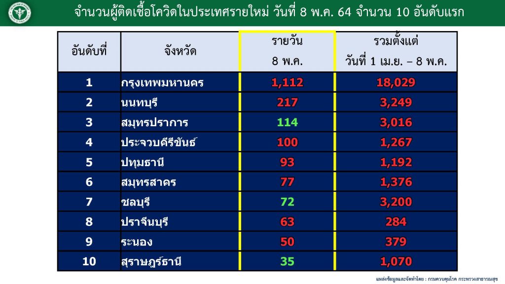 ส่วน 10 อันดับจังหวัดที่มีผู้ติดเชื้อโควิด-19 ในประเทศ วันที่ 8 พ.ค. 2564 คือ 1. กรุงเทพมหานคร 1,112 ราย 2. นนทบุรี 217 ราย 3. สมุทรปราการ 114 ราย 4. ประจวบคีรีขันธ์ 100 ราย 5. ปทุมธานี 93 ราย 6. สมุทรสาคร 77 ราย 7. ชลบุรี 72 ราย 8. ปราจีนบุรี 63 ราย 9. ระนอง 50 ราย 10. สุราษฎร์ธานี 35 ราย