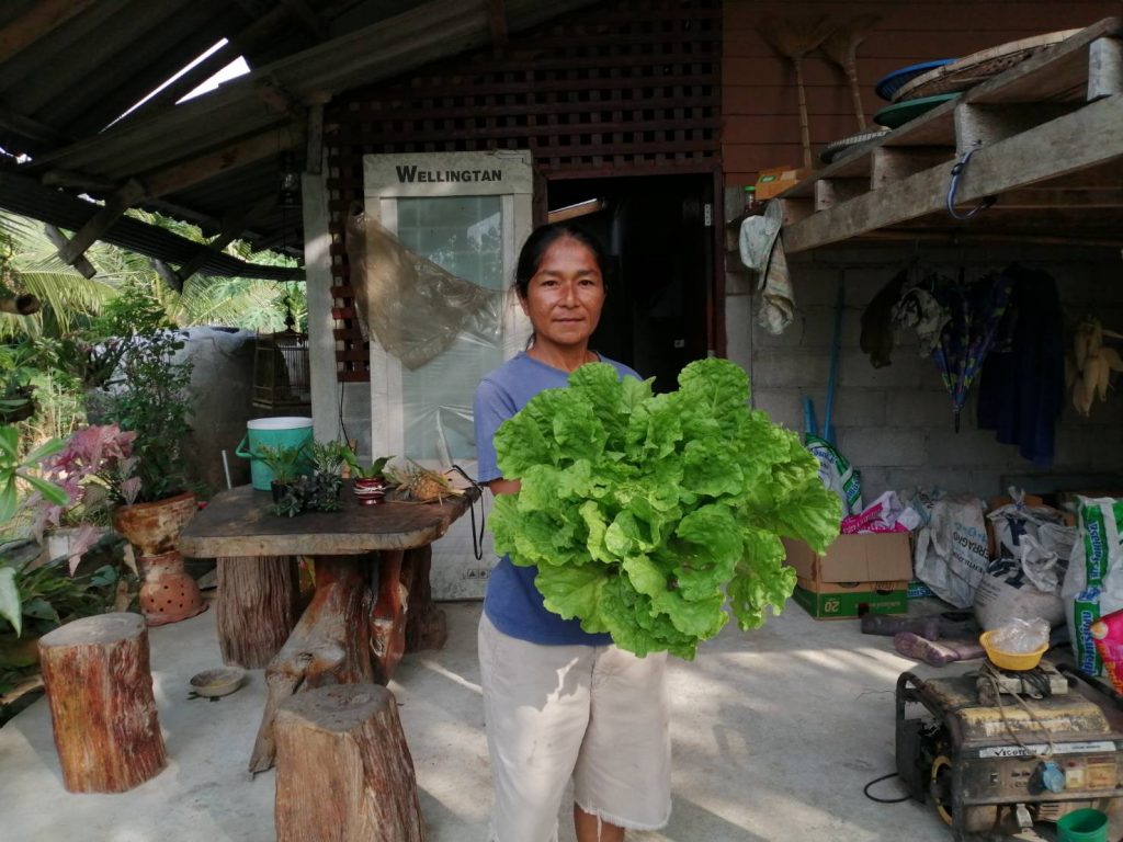 นอกจากนี้ ช่วงโควิดระบาด ทางชุมชนน้ำแดง ได้พูดคุยกับสมาชิกเรื่องการป้องกันตัวเอง และหาปลาในคลองผักข้างบ้านมาบริโภค เพื่อลดการเดินทางไปในที่เสี่ยงต่างๆ แล้วนำมาแลกเปลี่ยนกัน ในพื้นที่เรามีผักพื้นบ้านหลายชนิดพวกผักเหลียงหาง่ายมาก และช่วงนี้เริ่มเตียมดินเพาะปลูก ข้าวโพด ถั่ว แตง ฟัก เพราะสมาชิกในชุมชนส่วนใหญ่มีรายได้หลักคือ ปาล์มน้ำมันและตัดยางอยู่แล้ว ตอนนี้ทางกลุ่มกำลังจะทำโรงเรือนผักกลางมุ้งชุมชนเพื่อทุกคนจะได้ได้บริโภคผักปลอดภัย ขณะที่กลุ่มวิสาหกิจชุมชนรวมพลังสร้างอาชีพวัดประดู่ ต.ปากฉลุย ซึ่งมีปาล์มน้ำมันอายุ 5 ปี ที่สามารถเก็บเกี่ยวผลผลิตได้อย่างต่อเนื่องจำนวนหลายสิบไร่ ทำรายได้ให้สมาชิกครั้งละ 40,000 -60,000 บาท ซึ่งสมาชิกตกลงใช้เงินรายได้ดังกล่าวมาพัฒนาพื้นที่ร่วมกับงบประมาณที่ บจธ. สนับสนุน และองค์การบริหารส่วนตำบลปากฉลุยได้สนับสนุนการพัฒนาเส้นทางเข้าพื้นที่ ล่าสุดยังได้เตรียมพื้นที่ปลูกไม้ยืนต้นประจำถิ่น และพืชผักอายุสั้น รวมทั้งทยอยสร้างบ้านพักอาศัยแล้ว