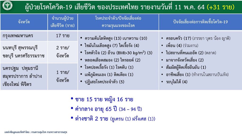 นพ.ทวีศิลป์ กล่าวว่า สำหรับรายละเอียดผู้เสียชีวิต 31 ราย เป็นเพศชาย 15 ราย เพศหญิง 16 ราย อายุระหว่าง 34-94 ปี อยู่ในพื้นที่ กทม.มากที่สุด 17 ราย นนทบุรี สุพรรณบุรี ชลบุรี นครศรีธรรมราช จังหวัดละ 2 ราย นครปฐม ปทุมธานี สมุทรปราการ ลำปาง เชียงใหม่ พิจิตร จังหวัดละ 1 ราย โดยมีโรคประจำตัว เป็นโรคความดันโลหิตสูงมากสุด 13 ราย เบาหวาน 10 ราย ไขมันในเลือดสูง 7 ราย ไตเรื้อรัง 4 ราย โรคหัวใจ โรคปอดเรื้อรัง ภาวะอ้วน ไทรอยด์ โรคตับ แพ้ภูมิตัวเอง ปฏิเสธโรคประจำตัว ติดเตียง โดยในจำนวนนี้ เป็นการติดเชื้อจากสมาชิกในครอบครัวมากสุด 17 ราย เพื่อน 4 ราย ไปสถานที่แออัด เช่น ตลาด 2 ราย มาจากจังหวัดเสี่ยง 2 ราย สัมผัสผู้ป่วยยืนยัน 1 ราย อาชีพเสี่ยง ทำงานในสถานบันเทิง 1 ราย และระบุไม่ได้ 4 ราย