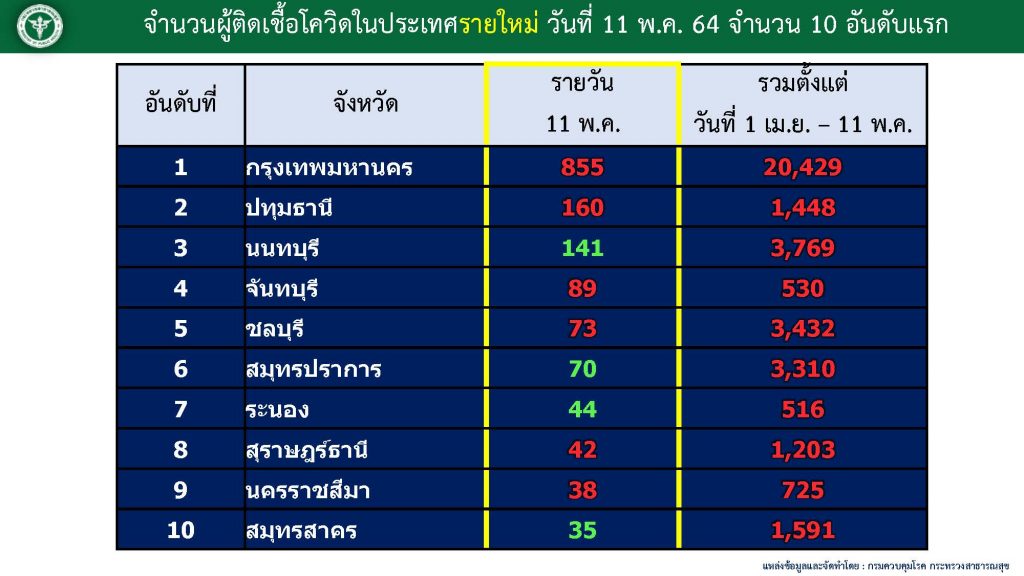 ส่วน 10 อันดับ ผู้ติดเชื้อโควิด-19 ในประเทศ วันที่ 11 พ.ค. 2564 คือ 1. กรุงเทพมหานคร 855 ราย 2. สมุทรปราการ 160 ราย 3. นนทบุรี 141 ราย 4. จันทบุรี 89 ราย 5. ชลบุรี 73 ราย 6. สมุทรปราการ 70 ราย 7. ระนอง 44 ราย 8. สุราษฎร์ธานี 42 ราย 9. นครศีธรรมราช 38 ราย 10. สมุทรสาคร 35 ราย