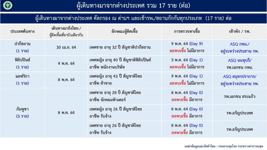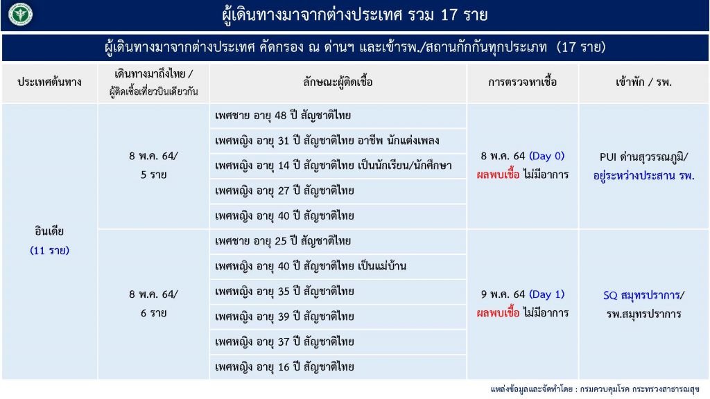 ส่วนผู้ที่เดินทางกลับมาจากต่างประเทศวันนี้ พบผู้ป่วยกลับมาจากอินเดีย 11 ราย ทั้งหมดเป็นคนไทยที่ขอเดินทางกลับ โดยทั้งหมดพบเชื้อตั้งแต่วันแรกที่ถึงไทย 5 รายตรวจพบที่ด่านสุวรรณภูมิ, 6 ราย พบใน SQ และในวันนี้ พบผู้ป่วยที่เดินทางกลับมาจากกัมพูชา 3 ราย ขอย้ำกับคนไทยที่อยู่ในกัมพูชา และต้องการเดินทางกลับ ขอให้กลับมาอย่างถูกกฎหมาย แม้ว่าการเดินทางออกไป อาจจะไม่ถูกต้อง แต่ขอให้ติดต่อเข้ามาตามระบบ เพราะถ้าป่วยก็จะได้ดูแล รักษาให้ได้ ไม่ต้องกังวล