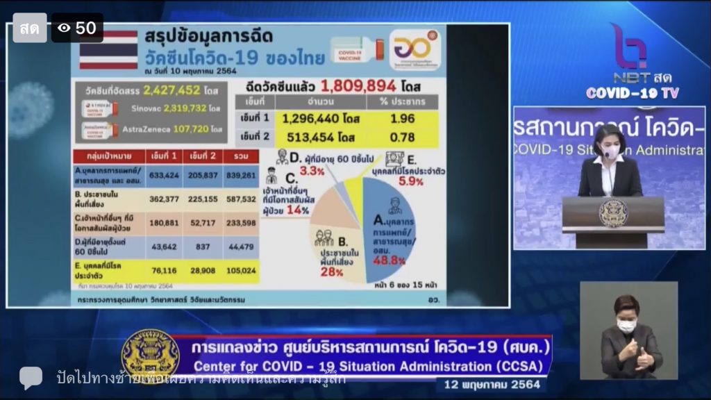 ขณะที่กระทรวงอุดมศึกษาวิทยาศาสตร์วิจัยและนวัตกรรมสรุปข้อมูลการฉีดวัคซีนโควิดถึงวันที่ 10 พฤษภาคม ฉีดวัคซีนแล้ว 1,809,894 โดส เป็นเข็มแรก 1,296,440 โดส และเข็มสอง 513,454 โดส โดยในสัปดาห์นี้จัดระดมฉีดให้กับอาชีพสาธารณะทั้งผู้ขับขี่รถ เรือ เครื่องบิน ครู พนักงานเก็บขยะ พร้อมย้ำคนไทย 70% จะได้รับวัคซีนภายในเดือนธันวาคม 2564 กว่า 50 ล้านคน สธ. จัดเตรียมไว้ 100 ล้านโดส.- สำนักข่าวไทย