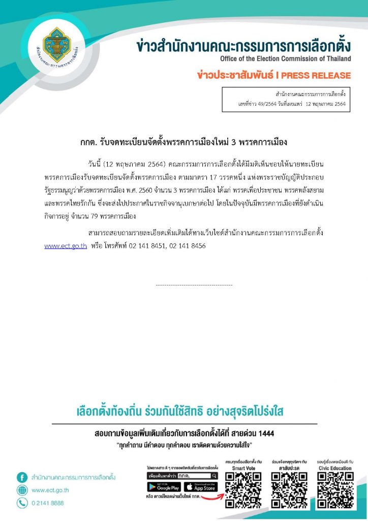 คณะกรรมการการเลือกตั้ง ได้มีมติเห็นชอบให้นายทะเบียนพรรคการเมือง รับจดทะเบียนจัดตั้งพรรคการเมือง ตามมาตรา 17 วรรคหนึ่ง แห่งพระราชบัญญัติประกอบรัฐธรรมนูญว่าด้วยพรรคการเมือง พ.ศ. 2560 จำนวน 3 พรรคการเมือง ได้แก่ พรรคเพื่อประชาชน พรรคพลังสยาม และพรรคไทยรักกัน ซึ่งจะส่งไปประกาศในราชกิจจานุเบกษาต่อไป