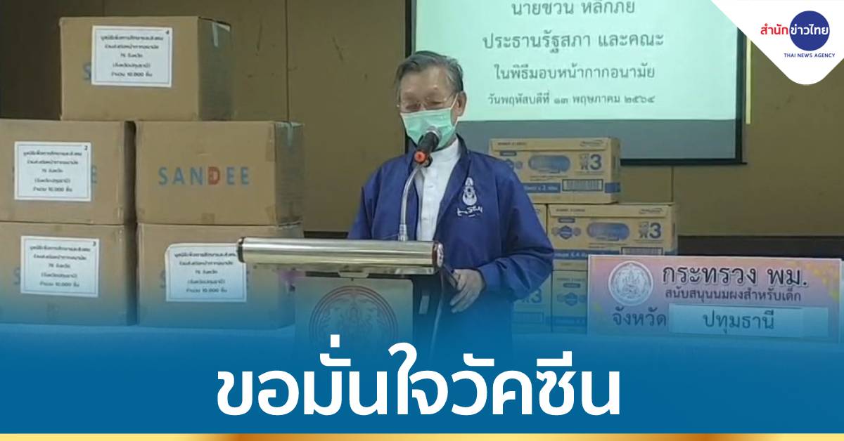 จปทุมธานี 13 พ.ค.-ประธานรัฐสภา มอบหน้ากากอนามัยกว่า 40,000 ชิ้น 4 จังหวัด ขอเชื่อมั่นวัคซีนคือมาตรการป้องกันโควิดที่ดีที่สุด พร้อมแนะตัดสายแมสก์ก่อนทิ้ง เป็นอันตรายต่อสัตว์ทะเล ใช้เวลาย่อยสลายนาน