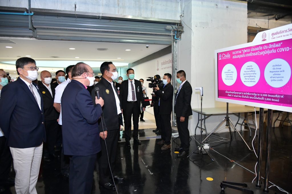 พล.อ.ประยุทธ์ รับฟังการบรรยายสรุป จากนั้นได้ตรวจเยี่ยมการให้บริการฉีดวัคซีนป้องกันโควิด-19 การให้บริการฉีดวัคซีน ณ. อาคารจัตุรัสจามจุรี จุฬาลงกรณ์มหาวิทยาลัย ที่ใช้หลักการสำคัญ คือ ปูพรม- ฉีดวัคซีนให้มากที่สุด โดยยึดหลัก 3 ป. คือ ปลอดภัย ปูพรม ประสิทธิภาพ โดยมีกลุ่มเป้าหมายเป็นผู้รับบริการเป็นผู้ที่มีความเสี่ยงในการติดเชื้อสูง ได้แก่ ครู อาจารย์ บุคลากรทางการศึกษา และกลุ่มผู้ให้บริการสาธารณะ เช่น พนักงาน ขสมก. โดยทีมแพทย์ พยาบาล เภสัชกรที่เชี่ยวชาญและมีประสบการณ์จากจุฬาลงกรณ์มหาวิทยาลัย และโรงพยาบาลจุฬาลงกรณ์ สภากาชาดไทย มีการเตรียมระบบให้วัคซีนที่ปลอดภัยและครบถ้วนในทุกขั้นตอน จนถึงการดูแลและสังเกตอาการ