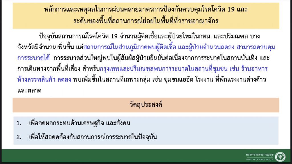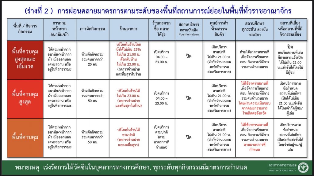 อย่างไรก็ตาม ศบค. เห็นควรผ่อนคลาย สำหรับพื้นที่ควบคุมสูงสุดและเข้มงวด (สีแดงเข้ม) มีการผ่อนคลายจากมาตรการเดิม คือ เรื่องร้านอาหาร สามารถนั่งทานในร้านได้ไม่เกิน 25% หรือ เท่ากับว่า โต๊ะ 4 คน นั่งได้ 1 คน และไม่เกิน 21.00 น. ส่วนการสั่งซื้อกลับบ้านยังได้ถึง 23.00 น. และยังคงงดการจำหน่ายและดื่มสุราในร้าน , ส่วนพื้นที่ควบคุมสูงสุด (สีแดง) นั่งทานอาหารในร้านได้ไม่เกิน 23.00 น. งดการจำหน่ายและดื่มสุราในร้าน และในสถานศึกษาอนุญาตให้ใช้อาคารสถานที่แต่ต้องผ่านความเห็นชอบจากคณะกรรมการโรคติดต่อจังหวัด และ พื้นที่ควบคุม (สีส้ม) นั่งทานอาหารในร้านได้ตามปกติ แต่งดการจำหน่ายและดื่มสุราในร้าน รวมถึงในสถานศึกษาอนุญาตให้ใช้อาคารสถานที่แต่ต้องเป็นไปตามมาตรการที่กำหนด