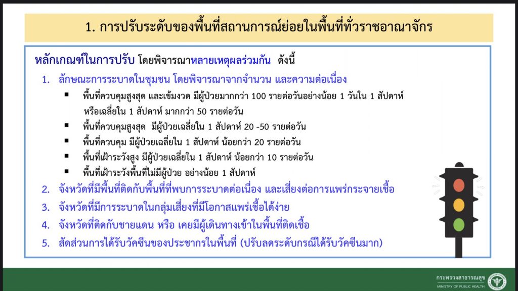 - สัดส่วนการได้รับวัคซีนของประชากรในพื้นที่ (ปรับลดระดับกรณีได้รับวัคซีนมาก)
