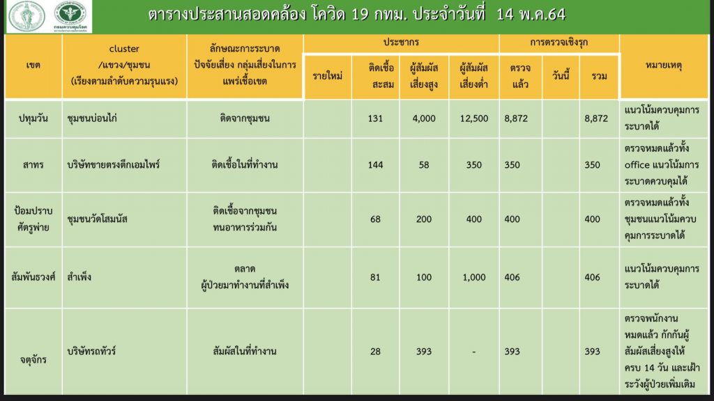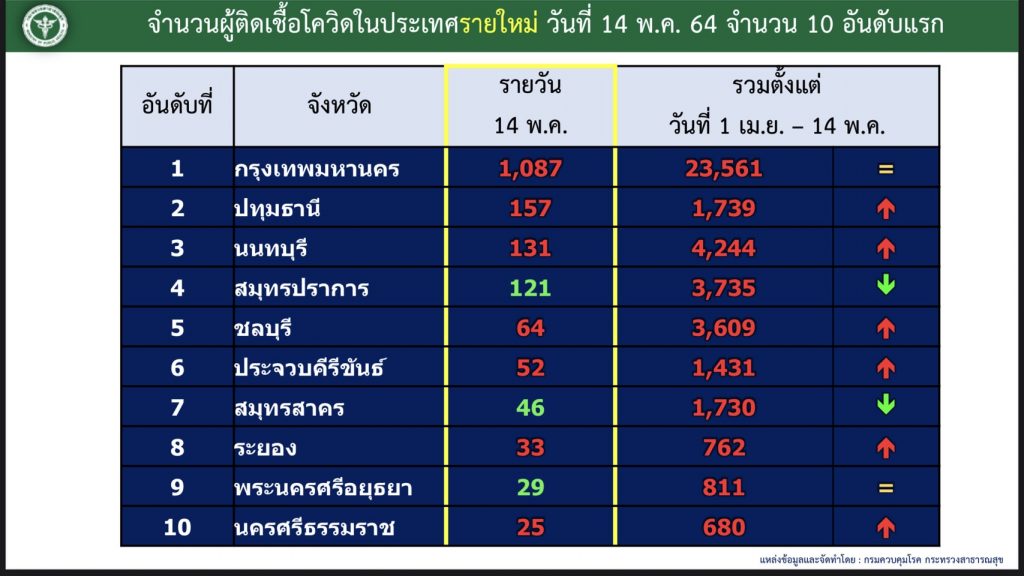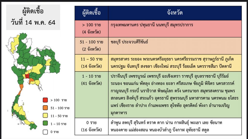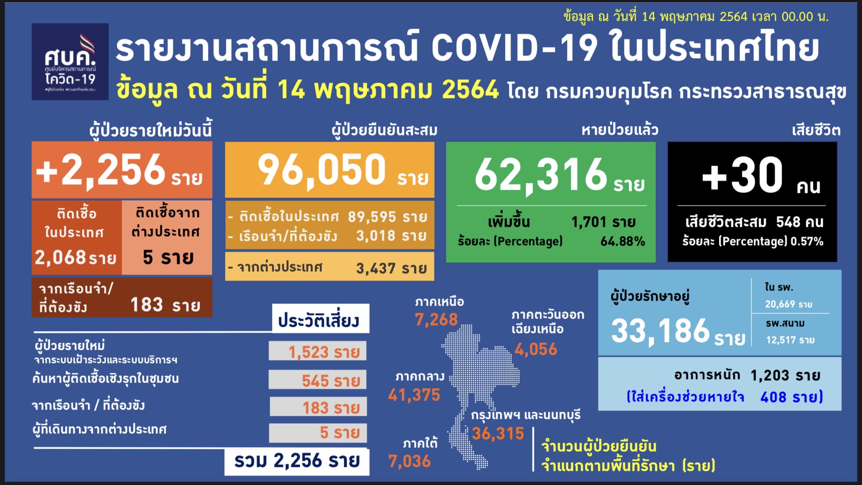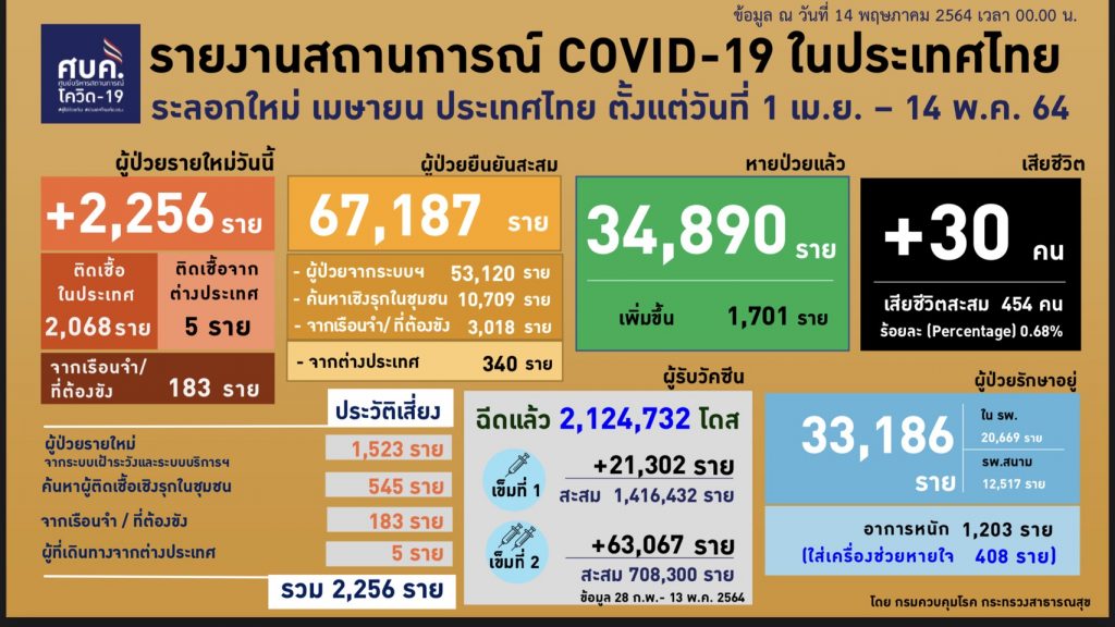 ผู้ป่วยยืนยันสะสมรอกใหม่ ตั้งแต่วันที่ 1 เมษายน 2563-14 พฤษภาคม 2564 จำนวน 67,187 ราย โดยผู้ติดเชื้อที่เพิ่มขึ้น 2,256 ราย เป็นผู้ที่ติดเชื้อในประเทศ 2,068 ราย จากระบบเฝ้าระวังและบริการ 1,523 ราย, จากการค้นหาเชิงรุกในชุมชน 545 ราย, จากเรือนจำ 183 ราย, ติดเชื้อจากต่างประเทศ 5 ราย เดินทางมาจากกัมพูชา 2 ราย, มาเลเซีย 2 ราย, สหรัฐอาหรับเอมิเรตส์ 1 ราย ซึ่งแนวโน้มการพบผู้ป่วยทั้งประเทศยังคงพบในอัตราที่สูงขึ้น ทั้งจากการค้าหาเชิงรุก ส่วนยอดพบผู้ป่วยในเรือนจำ ลดลงเหลือเพียงร้อยกว่าราย ใน กทม. ปริมณฑล ยังคงพบผู้ป่วยสูง