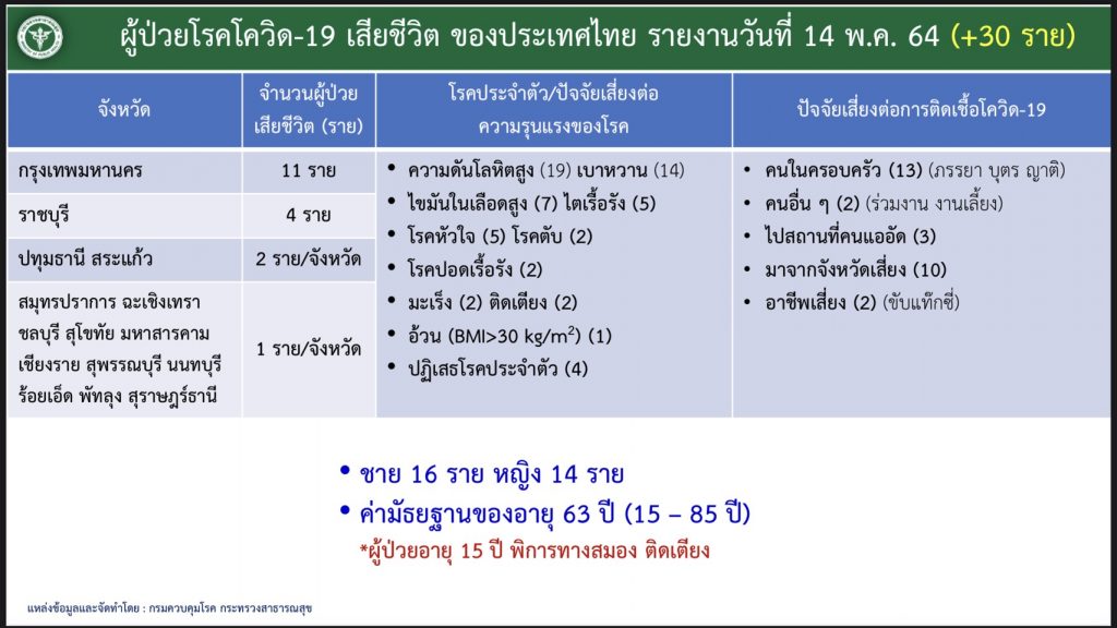 สำหรับรายละเอียดผู้ที่เสียชีวิต 30 คน เป็นชาย 16 คน หญิง 14 คน อายุระหว่าง 15 ถึง 85 ปี ส่วนใหญ่อยู่ในกรุงเทพฯ และราชบุรี โรคประจำตัวที่เป็นปัจจัยเสี่ยง ได้แก่ ความดันโลหิตสูง เบาหวาน ไขมันในเลือดสูง ไตเรื้อรัง โรคหัวใจ โรคตับ โรคปอดเรื้อรัง โรคมะเร็ง ปัจจัยเสี่ยงต่อการติดเชื้อ ยังคงมาจากคนในครอบครัว เพื่อนร่วมงาน ไปในฐานที่คนแออัด และการเดินทางมาจากจังหวัดพื้นที่เสี่ยง