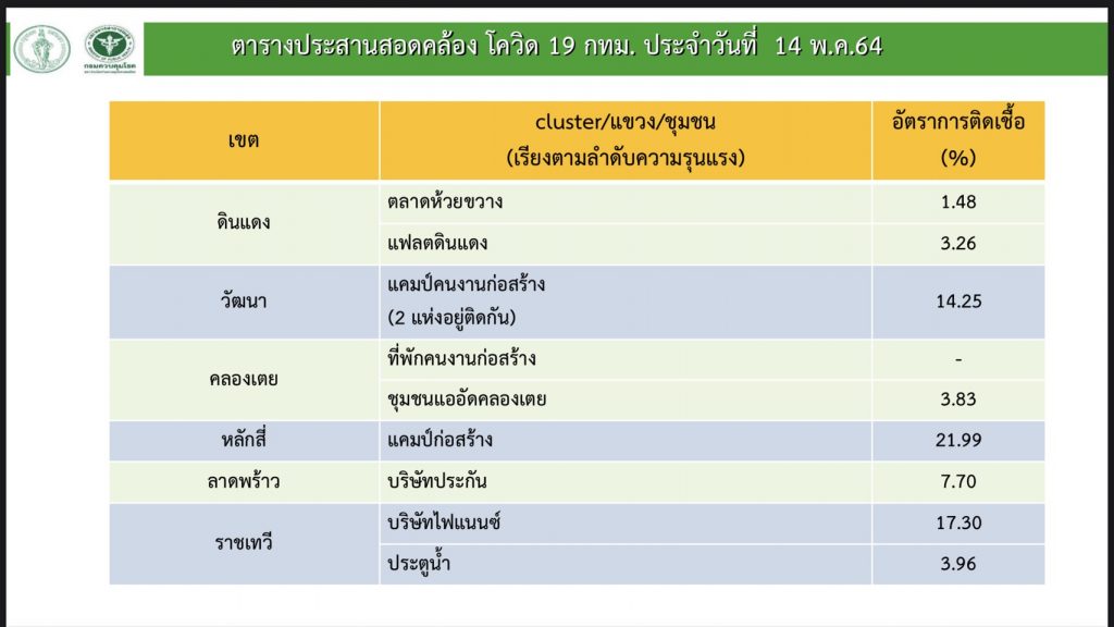 ทำเนียบ 14 พ.ค. –ศบค. เผยพบผู้ติดเชื้อรายใหม่ 2,256 ราย เสียชีวิตเพิ่ม 30 ราย อายุน้อยสุด 15 ปี พิการทางสมอง ติดเตียง ระบุ ระยะครองเตียงนานขึ้น มากถึงเดือนกว่า เตือนคนกรุงเทพฯ เฝ้าระวังตัวเองและสวมหน้ากากอนามัยต่อเนื่อง หลังหลายพื้นที่สุ่มตรวจพบติดเชื้อมากขึ้น ขณะที่เขตหลักสี่ พบแคมป์คนงานอัตราติดเชื้อมากสุด