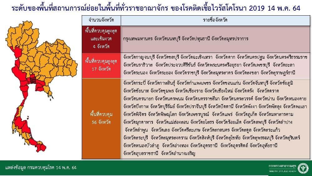 ส่วนพื้นที่ควบคุมสูงสุด 17 จังหวัด ประกอบด้วย กาญจนบุรี ชลบุรี ฉะเชิงเทรา ตาก นครปฐม นครศรีธรรมราช นราธิวาส ประจวบคีรีขันธ์ พระนครศรีอยุธยา เพชรบุรี ยะลา ระนอง ระยอง ราชบุรี สมุทรสาคร สงขลา และสุราษฎร์ธานี นั่งรับประทานอาหารในร้านได้ไม่เกิน 23.00 น. งดการจำหน่ายและดื่มสุราในร้าน และในสถานศึกษาอนุญาตให้ใช้อาคารสถานที่ แต่ต้องผ่านความเห็นชอบจากคณะกรรมการโรคติดต่อจังหวัด