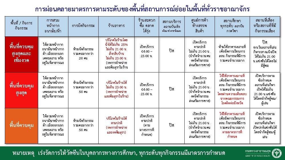 ขณะที่พื้นที่ควบคุม 56 จังหวัด นั่งรับประทานอาหารในร้านได้ตามปกติ แต่งดการจำหน่ายและดื่มสุราในร้าน รวมถึงในสถานศึกษาอนุญาตให้ใช้อาคารสถานที่ แต่ต้องเป็นไปตามมาตรการที่กำหนด