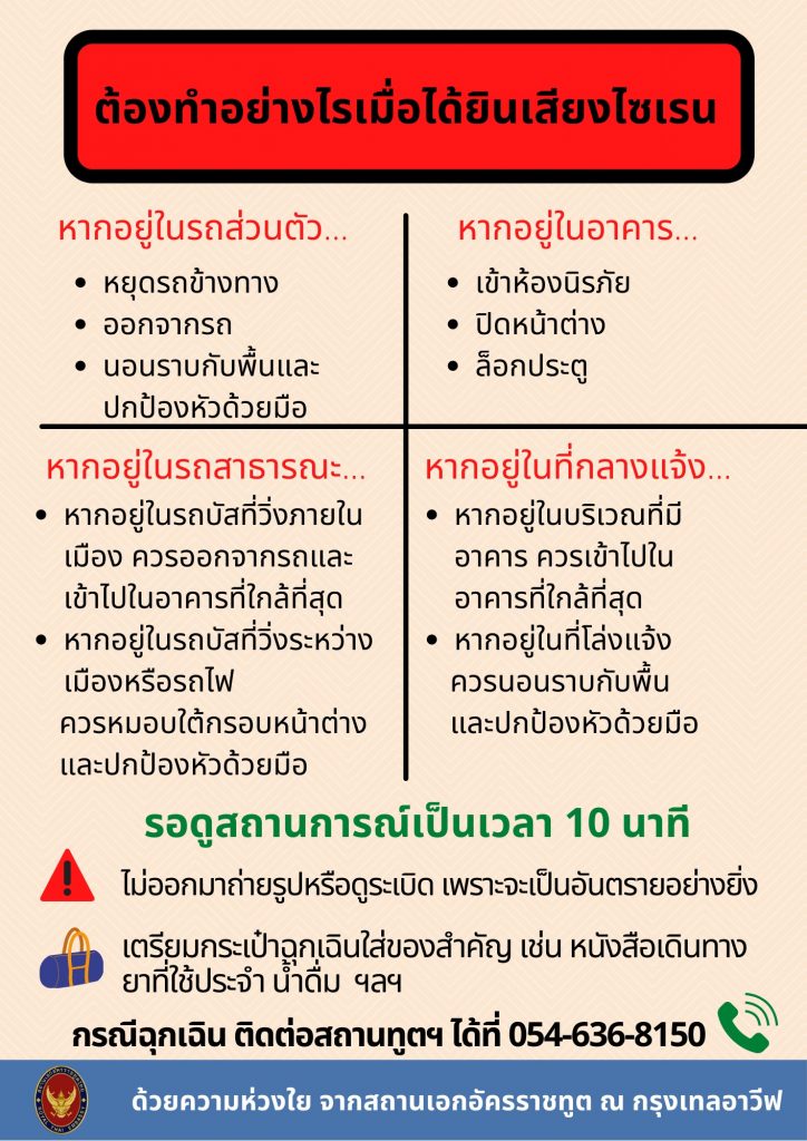 หากอยู่ในรถส่วนตัว ให้หยุดรถข้างทาง ออกจากรถและนอนราบกับพื้น ป้องศีรษะด้วยมือ หากอยู่ในรถสาธารณะ ควรลงจากรถ และเข้าไปในอาคารที่ใกล้ที่สุด หรือหากอยู่ในรถบัสหรือรถไฟที่กำลังเคลื่อนตัว ให้หมอบใต้กรอบหน้าต่าง และป้องศีรษะด้วยมือ หากอยู่ในอาคาร ให้หลบเข้าห้องนิรภัย ปิดหน้าต่างและล็อกประตู หากอยู่ในพื้นที่กลางแจ้ง ควรรีบเข้าไปในอาคารที่ใกล้ที่สุด หากไม่มีอาคารใด ๆ ให้นอนราบกับพื้น และป้องศีรษะด้วยมือ โดยให้รอดูสถานการณ์ 10 นาที ระหว่างนี้ไม่ควรออกมาถ่ายรูปหรือดูเหตุการณ์ระเบิด เพราะจะเป็นอันตราย ควรเตรียมกระเป๋าฉุกเฉิน ใส่สิ่งของสำคัญจำเป็นเตรียมพร้อมทั้งหนังสือเดินทาง ยาประจำตัวและน้ำดื่ม ซึ่งหากมีกรณีฉุกเฉิน สามารถติดต่อสถานเอกอัครราชทูตไทย ในกรุงเทลอาวีฟได้.-สำนักข่าวไทย