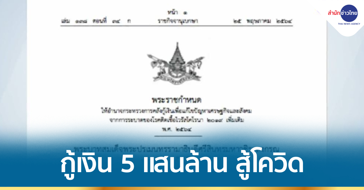 เว็บไซต์ราชกิจจานุเบกษาเผยแพร่พระราชกำหนดให้อำนาจกระทรวงการคลังกู้เงินเพื่อแก้ไขปัญหาเศรษฐกิจและสังคมจากการระบาดของโรคติดเชื้อไวรัสโคโรนา 2019 เพิ่มเติม พ.ศ.2564 โดยมี 9 มาตรา มีสาระให้อำนาจกระทรวงการคลังกู้เงิน เพื่อแก้ไขปัญหาการระบาดของโรคโควิด-19 เพื่อช่วยเหลือ เยียวยา และชดเชยให้แก่ประชาชนทุกสาขาอาชีพ ซึ่งได้รับผลกระทบ และเพื่อฟื้นฟูเศรษฐกิจและสังคมที่ได้รับผลกระทบจากการระบาดของโรคโควิด-19 ตามแผนงานหรือโครงการใช้จ่ายเงินกู้ให้เป็นไปตามที่คณะรัฐมนตรีอนุมัติตามบัญชีท้าย พ.ร.ก. รวมวงเงินกู้ทั้งหมดต้องไม่เกิน 500,000 ล้านบาท.-สำนักข่าวไทย