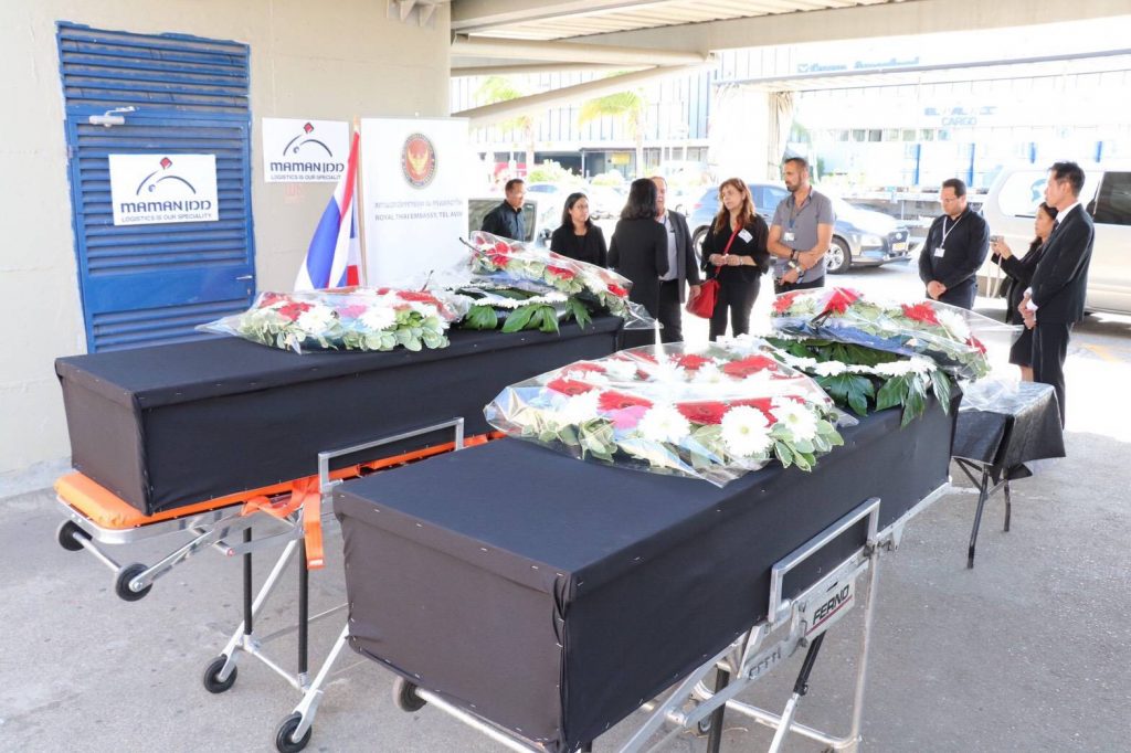 นอกจากนั้น เมื่อวานนี้ (25 พ.ค.) สถานเอกอัครราชทูตไทย กรุงเทลอาวีฟ ได้จัดพิธีไว้อาลัย และส่งร่างของนายวีรวัฒน์ การุญบริรักษ์ และนายสิขรินทร์ สงำรัมย์ 2 แรงงานไทย จากนิคมเกษตรกรรม (โมชาฟ) โอฮาด ที่เสียชีวิตจากจรวดโจมตี เมื่อวันที่ 18 พฤษภาคม 2564 ที่ท่าอากาศยานเบนกูเรียน โดยมีนางสาวพรรณนภา จันทรารมย์ เอกอัครราชทูตไทย กรุงเทลอาวีฟ และผู้แทนจากกระทรวงการต่างประเทศของอิสราเอล และท่าอากาศยานเบนกูเรียน ร่วมส่งร่างของแรงงานไทยที่เสียชีวิตทั้ง 2 โดยจะเดินทางถึงประเทศไทยพร้อมเที่ยวบินดังกล่าว และจะส่งร่างถึงภูมิลำเนาที่จังหวัดเพชรบูรณ์ และบุรีรัมย์ ในเวลาประมาณ 23.00 น. วันนี้ (26 พ.ค.)